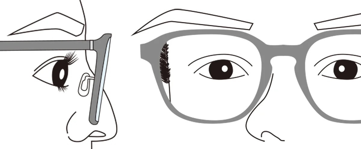 また、目とレンズの距離とされる『頂点間距離』も非常に重要です。頂点間距離が離れるほど、目が小さく見え、輪郭の映り込みも大きくなってしまいます。できるだけ目とレンズの距離が近づくように調整することで、目が小さく見えることを防ぐことができます。