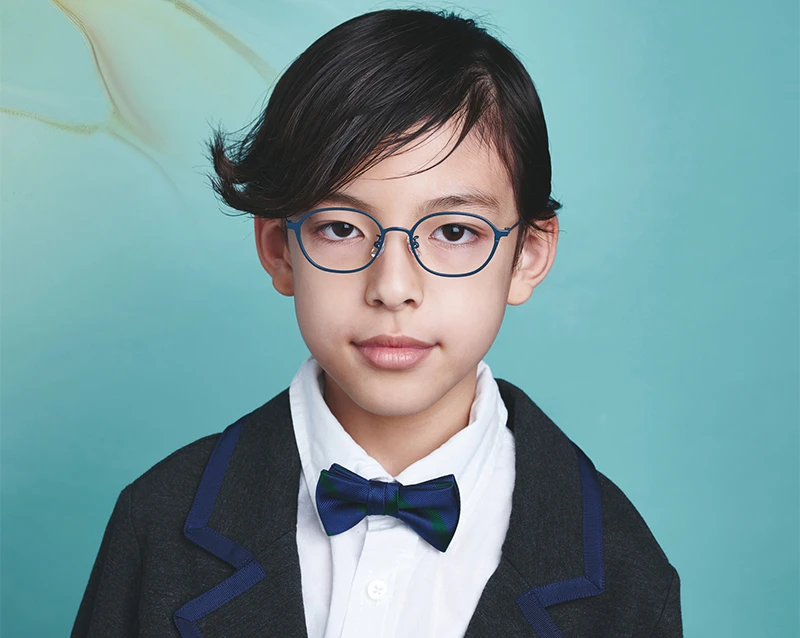 細いプラスチックを使用した柔らかい雰囲気のオーバル型の子供用メガネ。テンプルは弾力性にあるベータチタンを使用した超軽量フレームです。