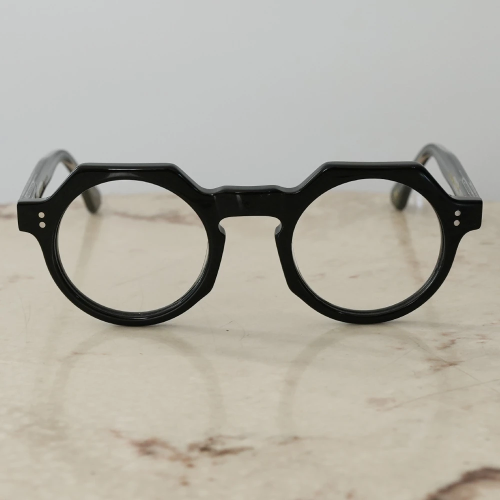一般的には珍しい真円のレンズが素敵なラウンドフレーム。全体的に柔らかいラインで構成されており、クラシックで温かみのある雰囲気。表側はブラックですが、裏側はブルーの綺麗なカラーが綺麗です。7枚兆番を使用した堅牢なメガネです。