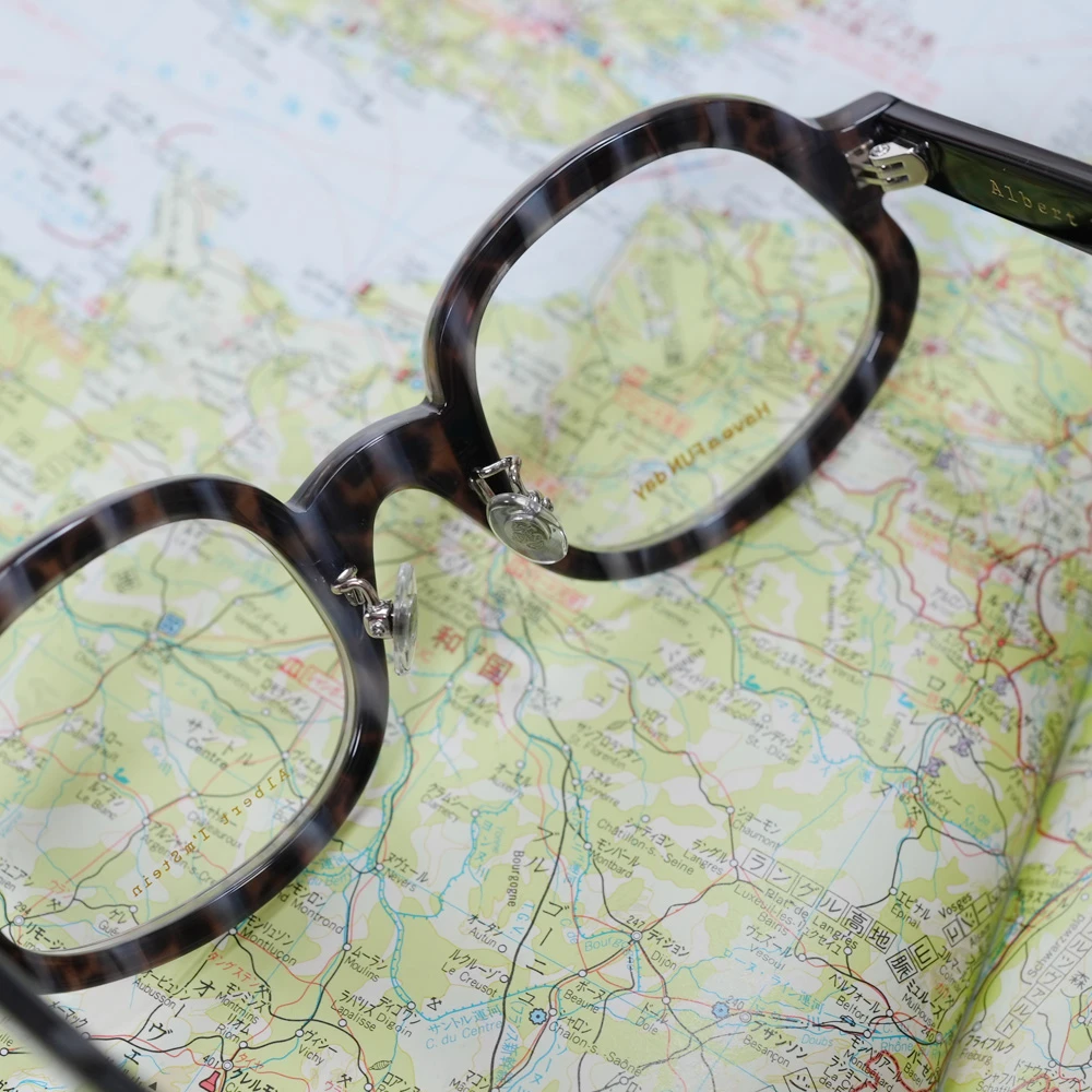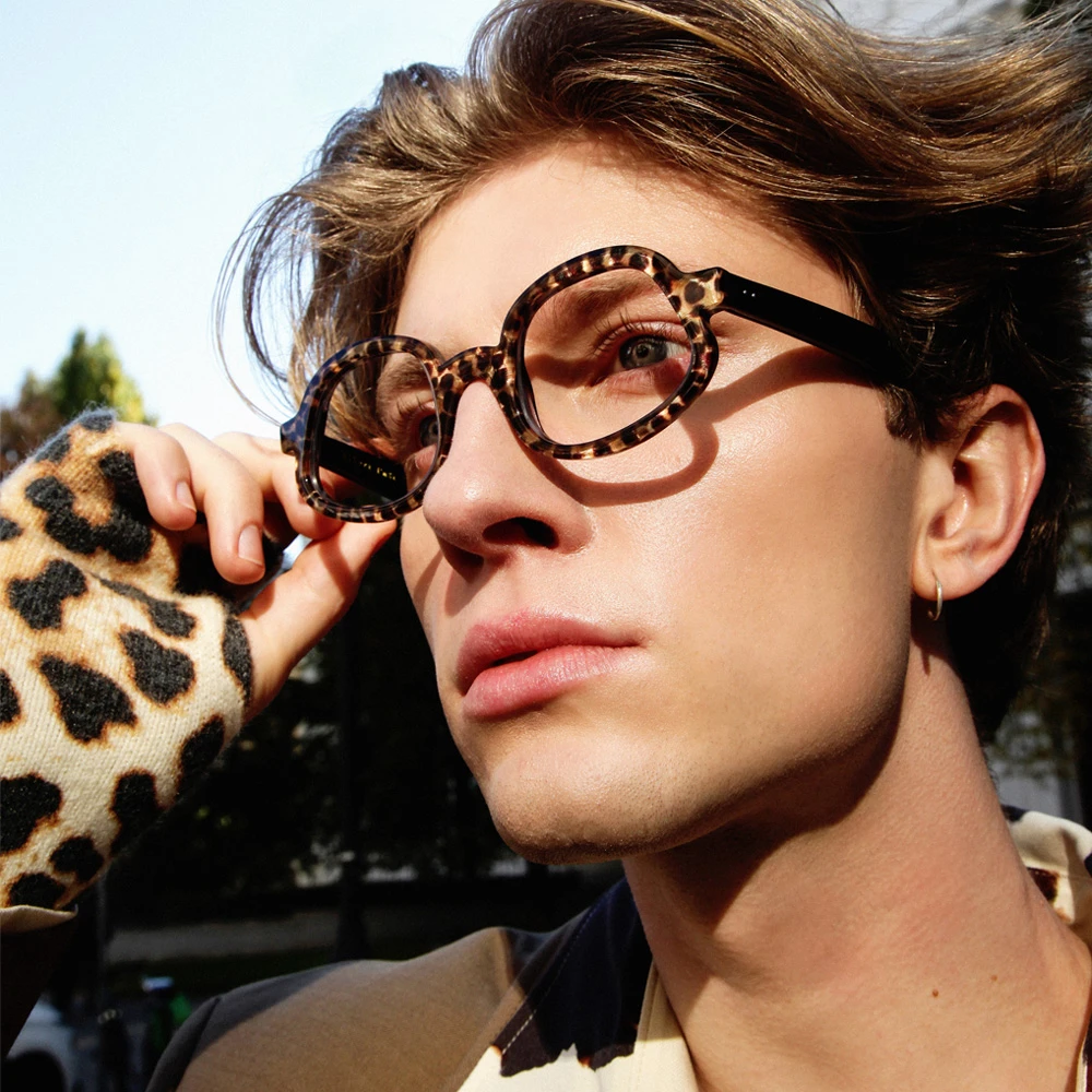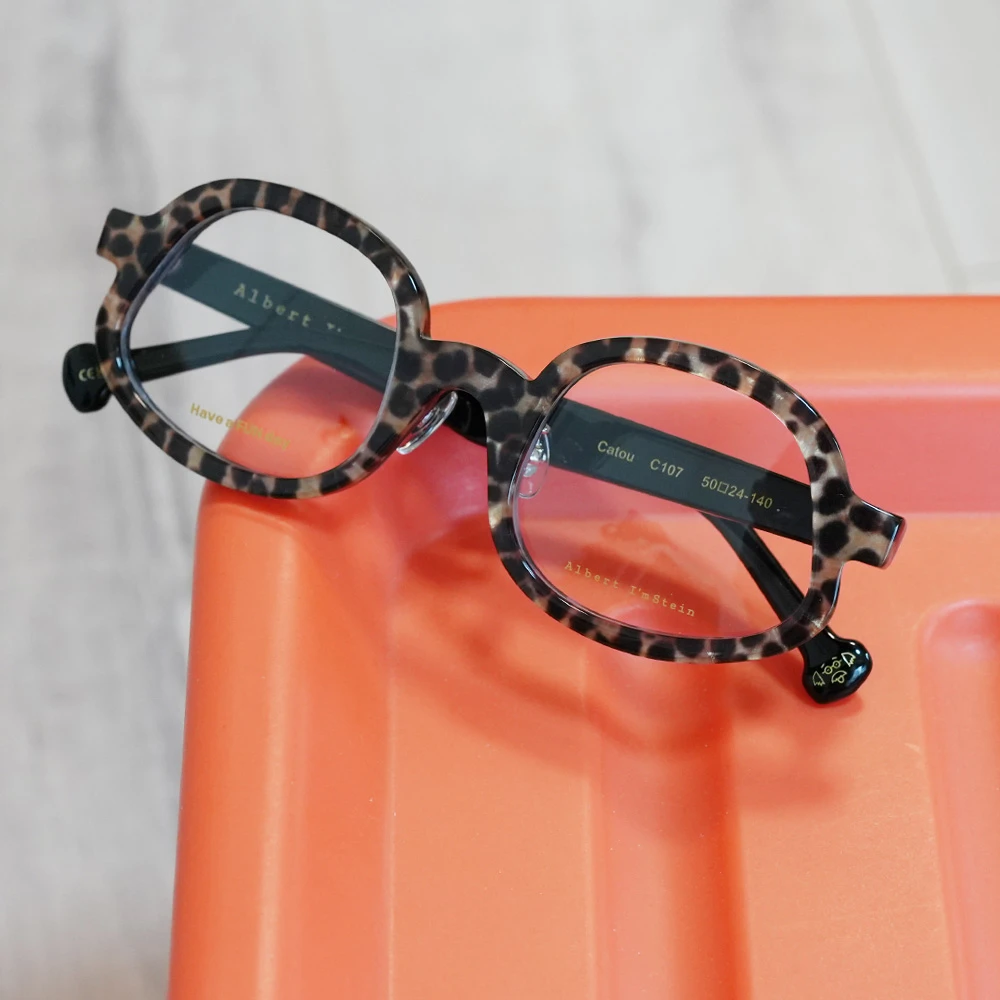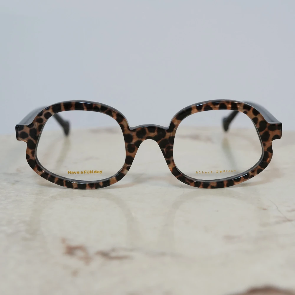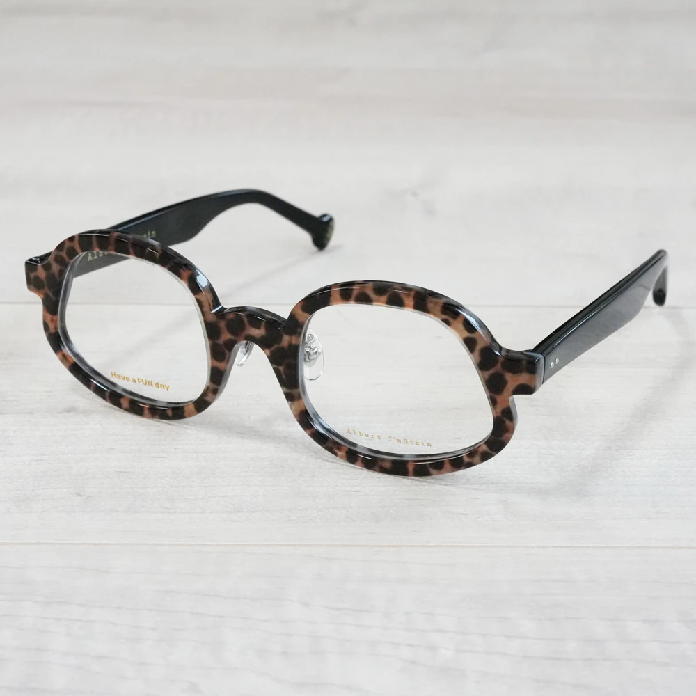 下膨れの笑っているようなレンズシェイプと豹柄の組み合わせが限りなくユニーク。着用すると見た目から想像するよりずっとナチュラル、新しいひらめきが感じられそうなデザインです。