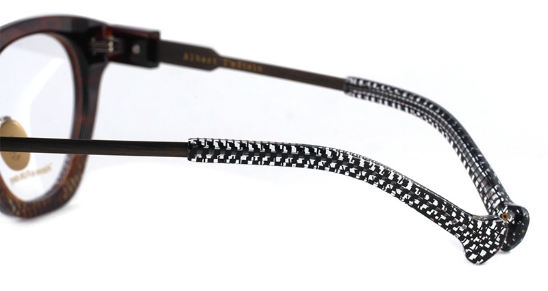 かっちりした印象のシックなスクエアフレーム、フロント両サイドに取り付けられたメタルパーツは左右非対称。落ち着いたデザインですが、フロントの色合わせなど個性とこだわりは十分に感じられます。金属製クリングスパッド付き、弾力性のあるチタンテンプルで掛け心地の良さも魅力的です。