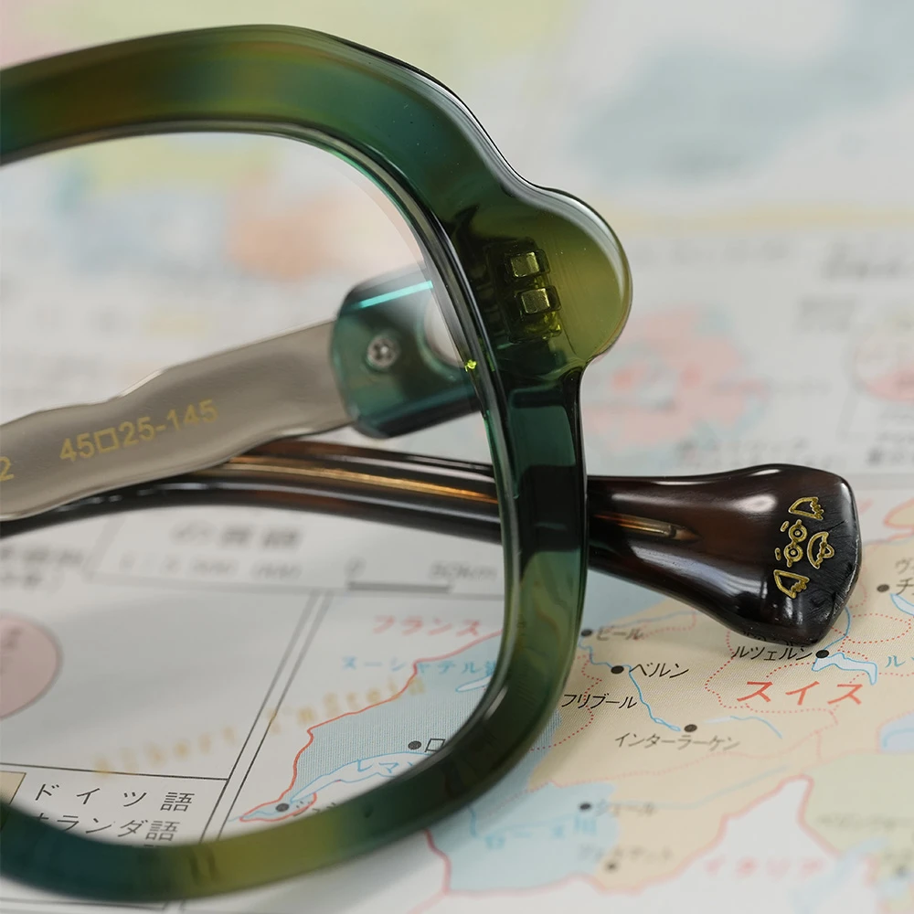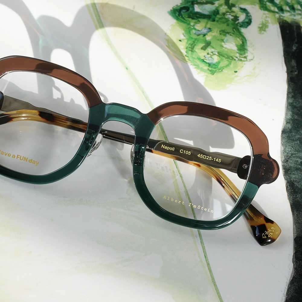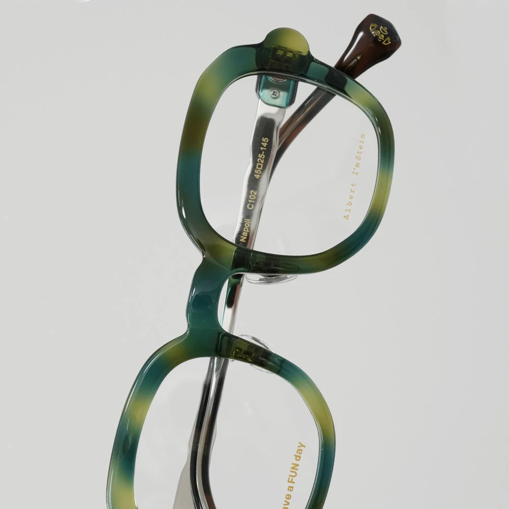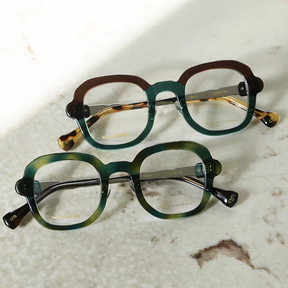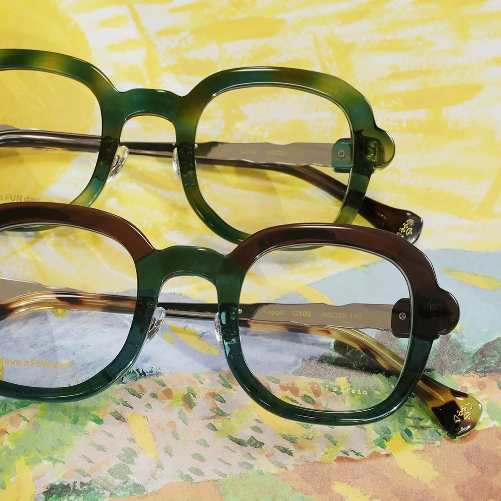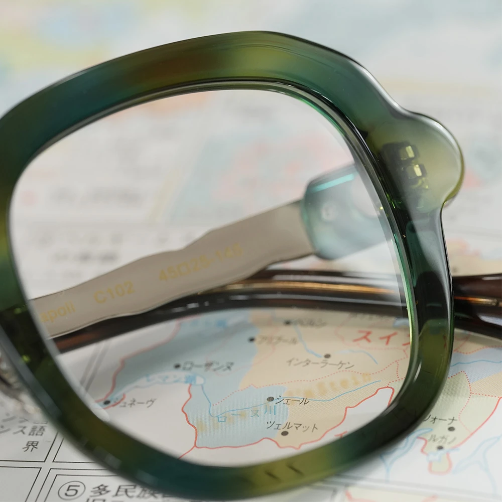 ピザで有名なイタリア南部の海岸都市ナポリ、丸く伸ばされたピザ生地のような有機的で少しいびつなフォルムな印象的な優しいスクエアシェイプ。半円形のプラスチックパーツを組み合わせた、いびつな形状のチタンテンプルも個性的。性別問わずお勧めできる魅力の詰まったメガネです。クリングスパッド付きで掛け心地も良好です。 size:レンズ横幅44mm 縦幅41mm レンズ間距離25mm フロント幅136mm