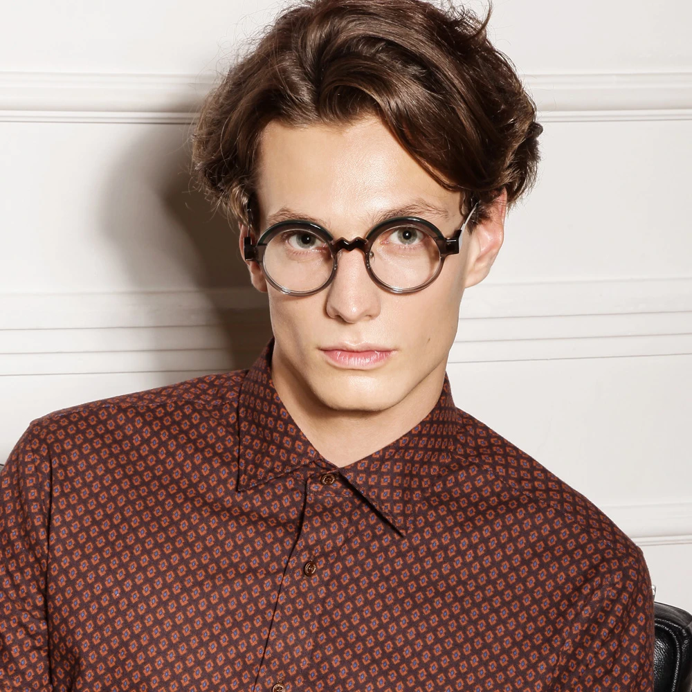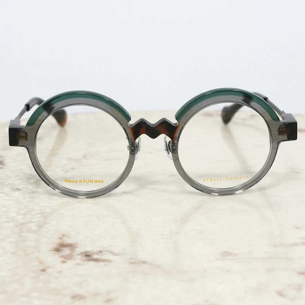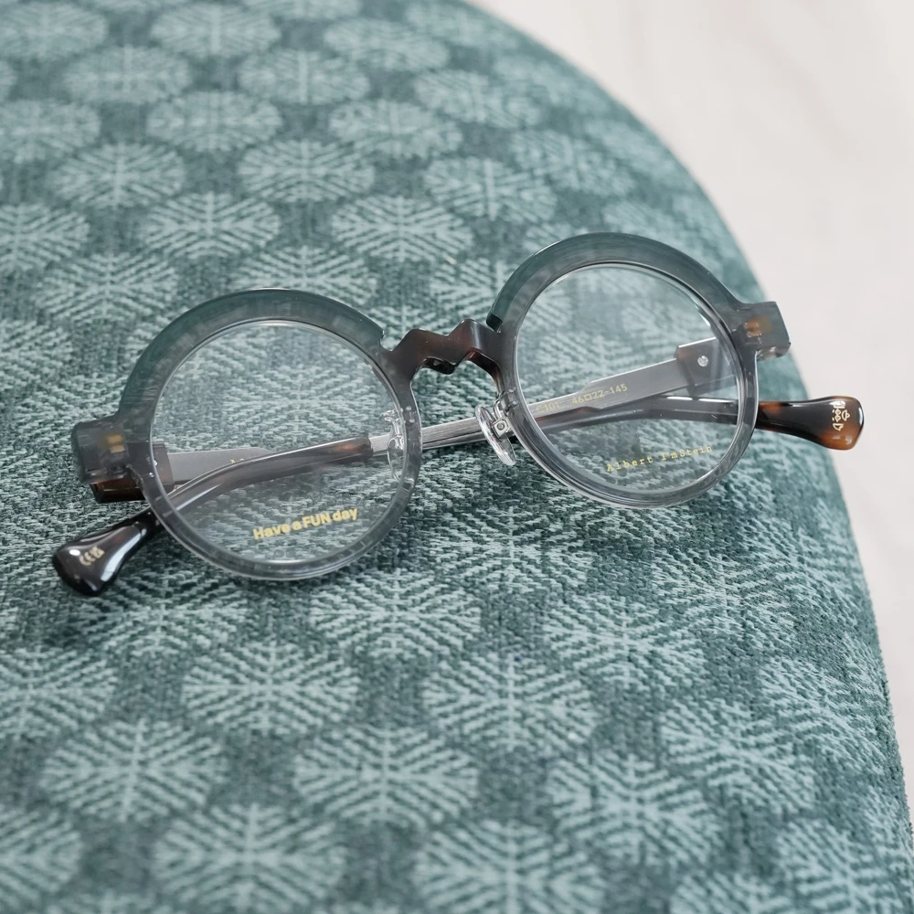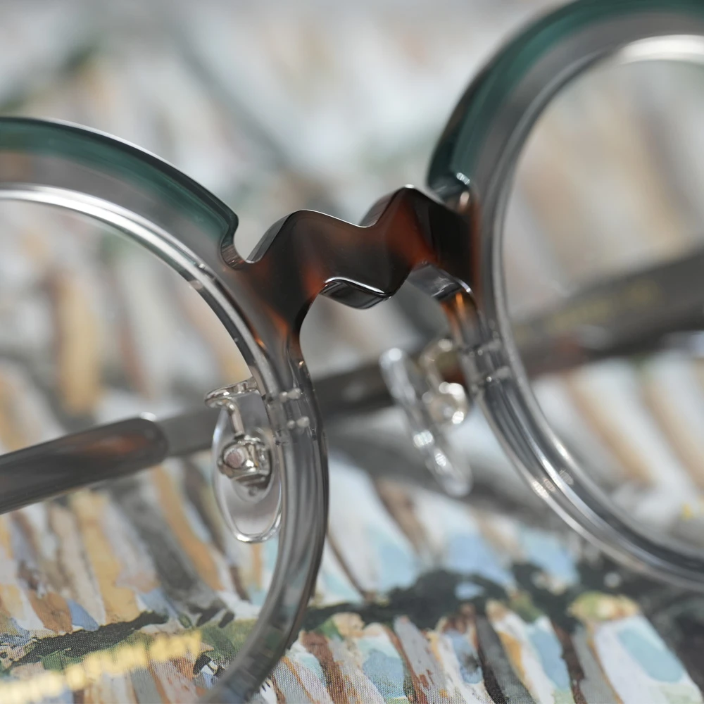 コロナ渦、「事態の収束、楽しい日常」を願ってデザインされたユニークなラウンドフレーム。ブリッジのジグザグが紆余曲折を表しているのかもしれませんが、ひたすらに前向き、皆を笑顔にするメガネは、着用してみると程良い感じの個性を発揮します。