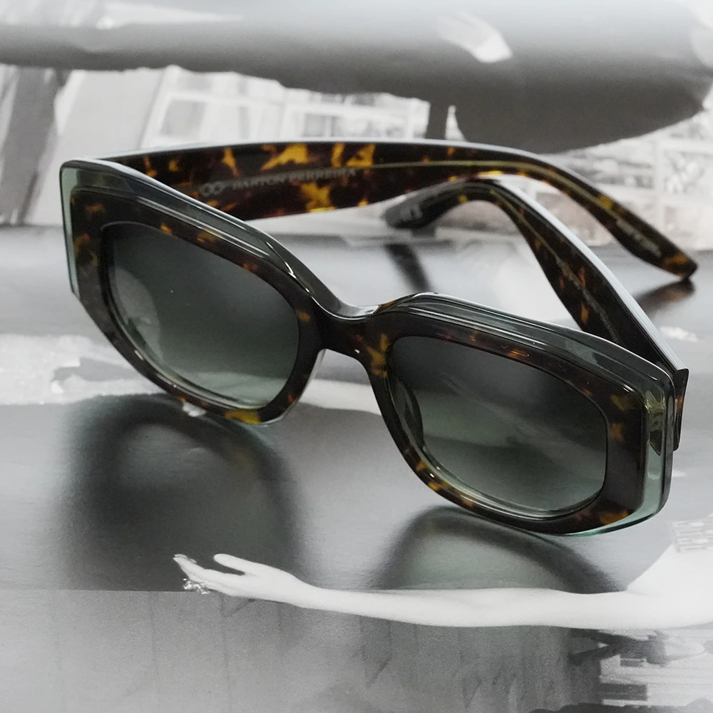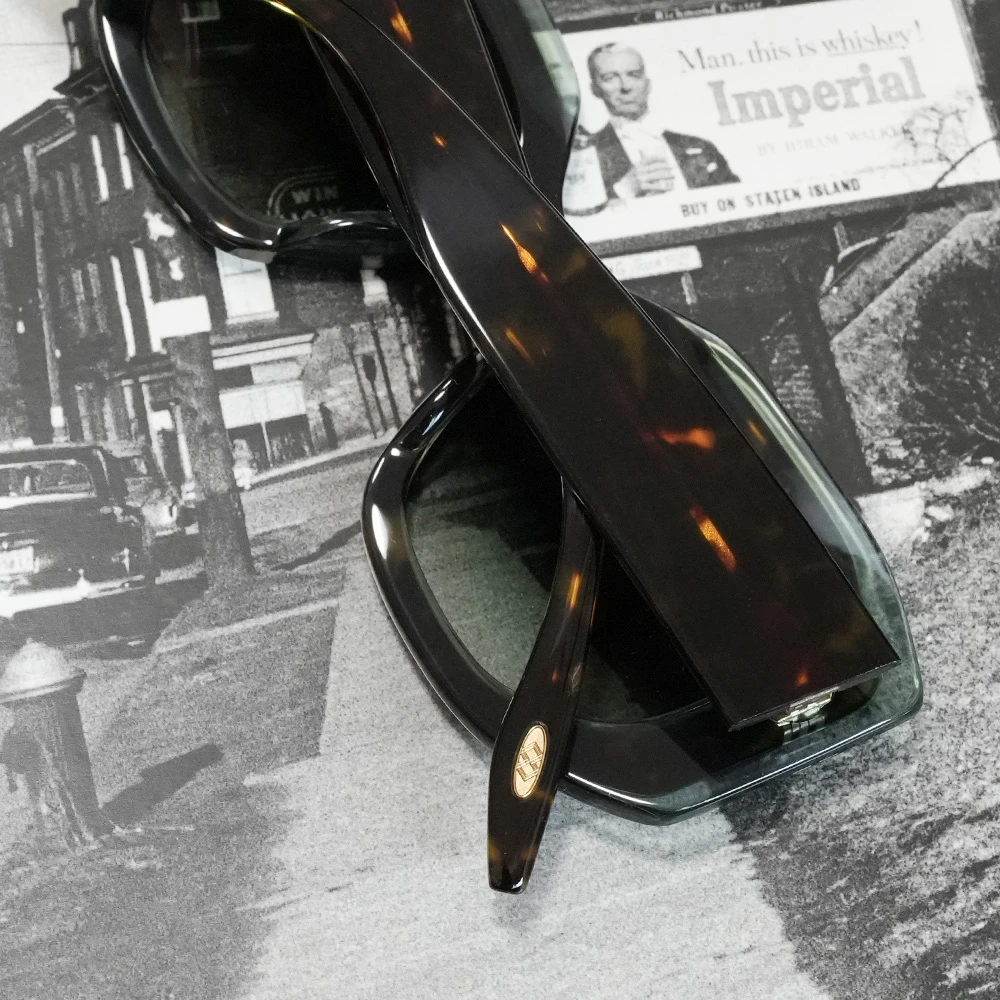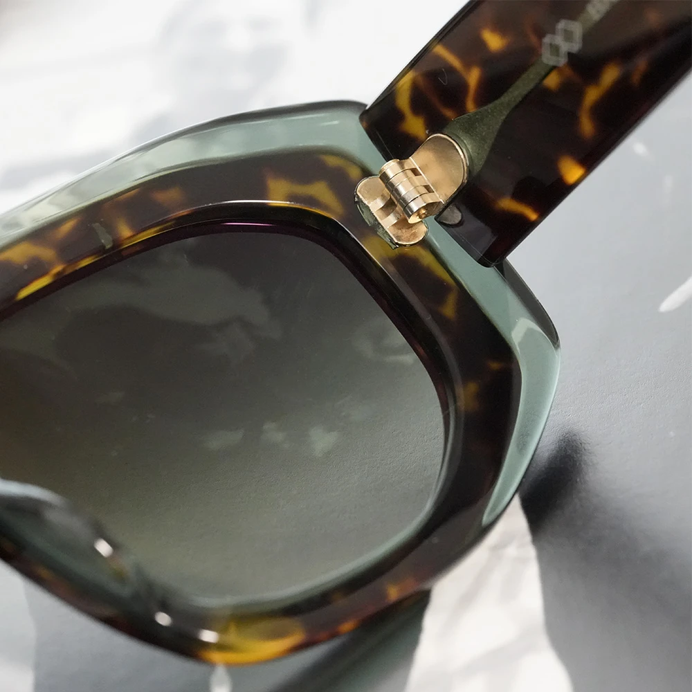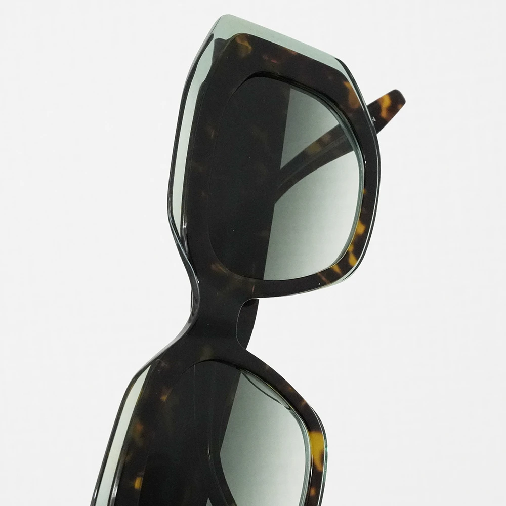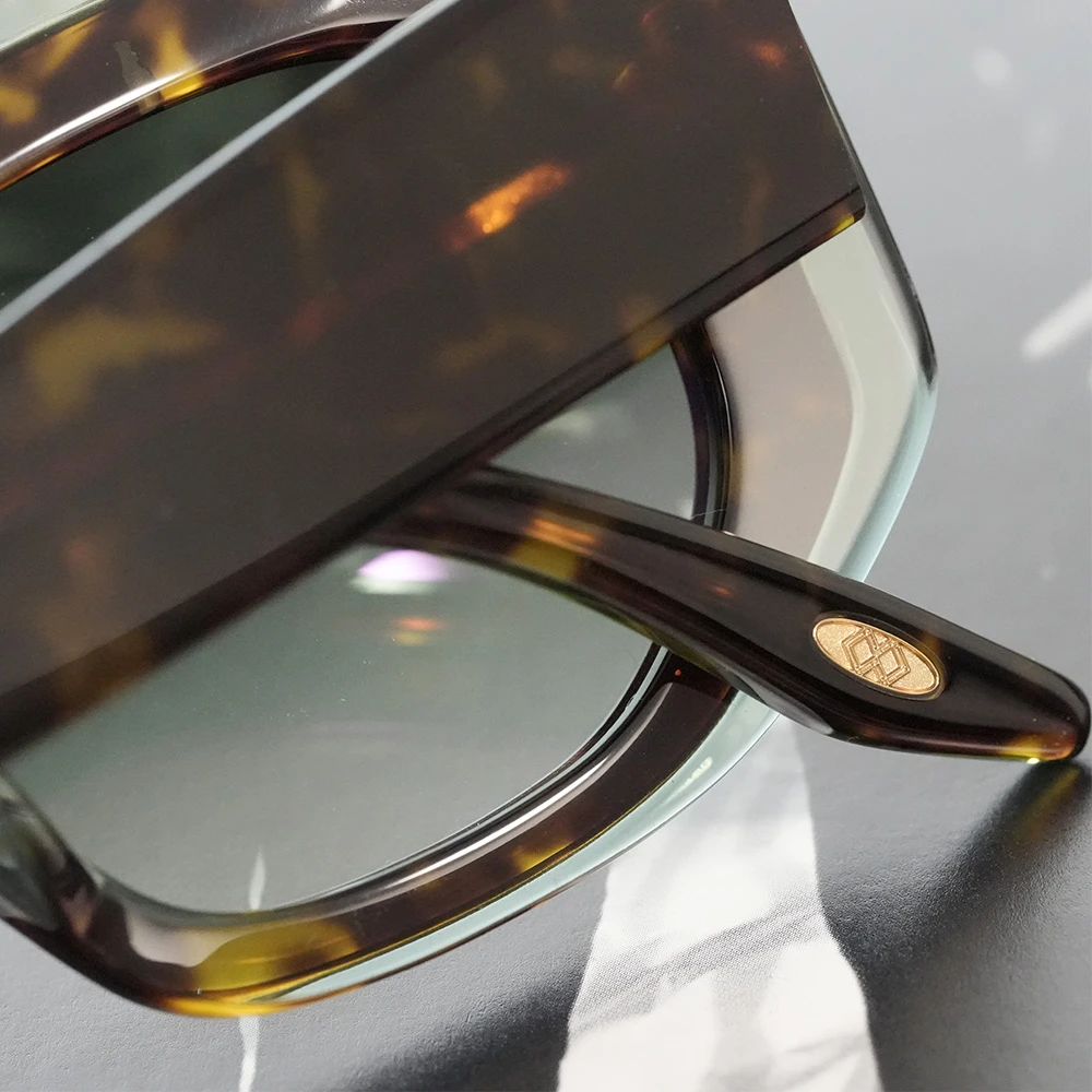 重ね合わされたカラーが美しい調和を奏でるスクエアシェイプ。ボリューム感はありますが軽やかな雰囲気、どの角度から見てもリズム感が感じられる華やかなサングラスです。