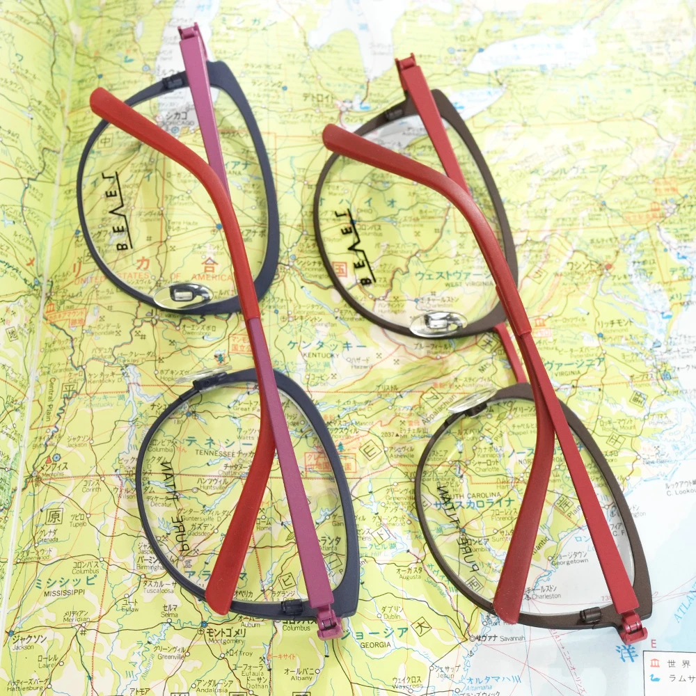 テンプルが外側に広がるオリジナルのバネ蝶番採用、日本で製造されたチタンフレームは軽量で掛け心地も非常に良いメガネです。
