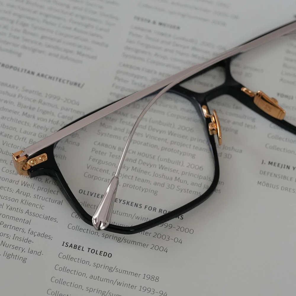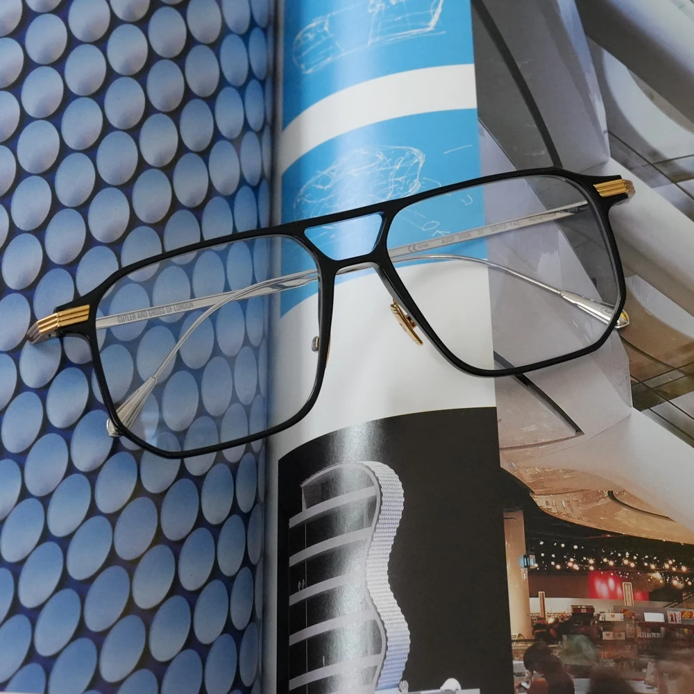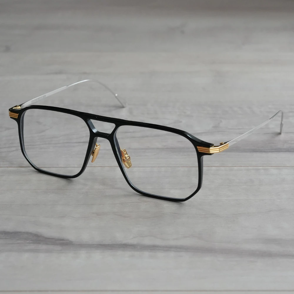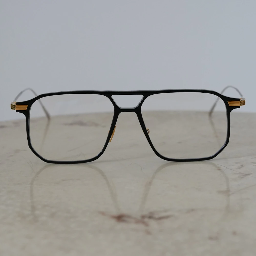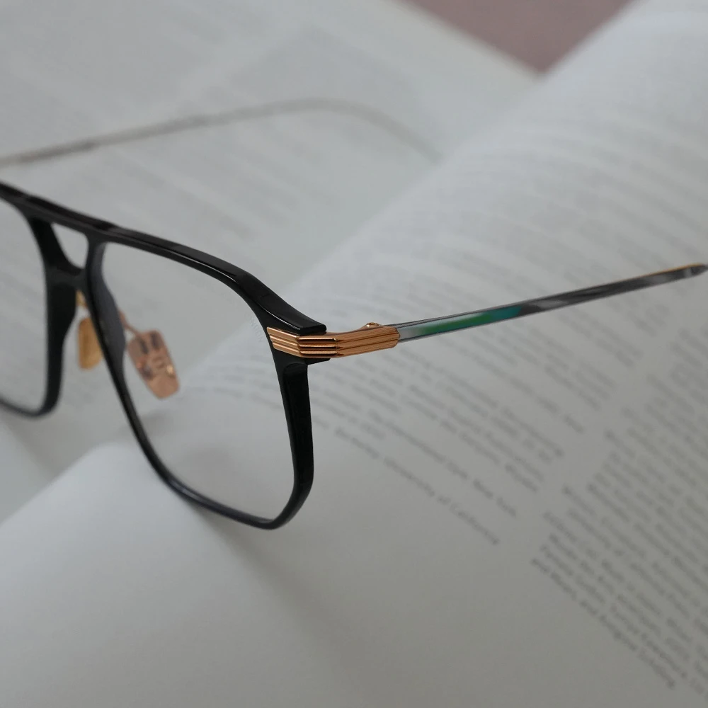 ダブルブリッジ、ビッグシルエットのナビゲーターシェイプですが、線が細いため上品でエレガントな印象。フロントも薄いアセテートプラスチックを使用し軽量に仕上げています。金属製パッド付きで掛け心地も良好です。ラグジュアリーな輝きがコンセプトの「オーラムコレクション」のアイウェアです。