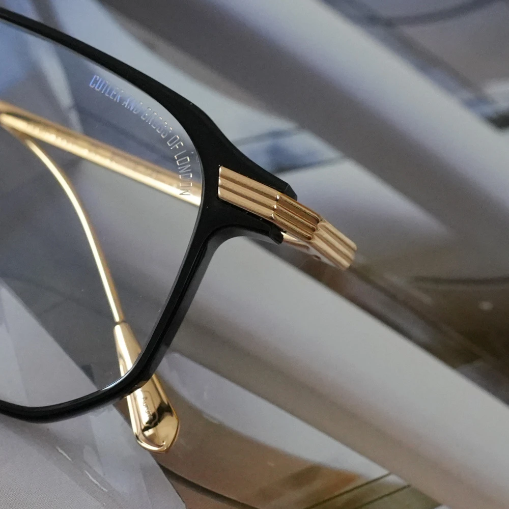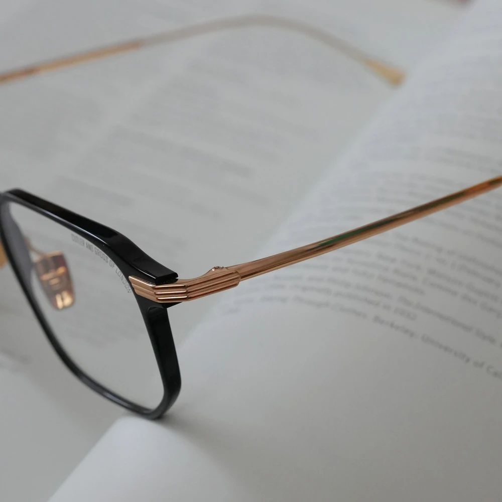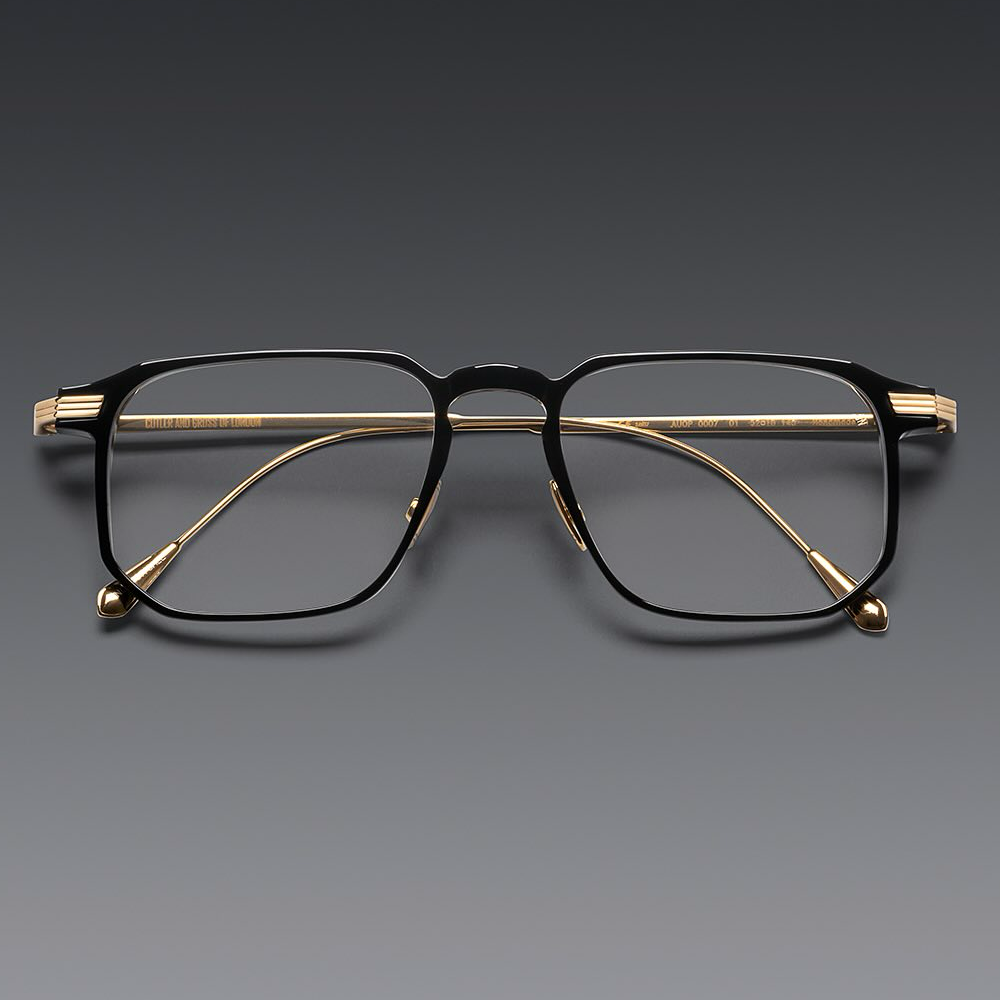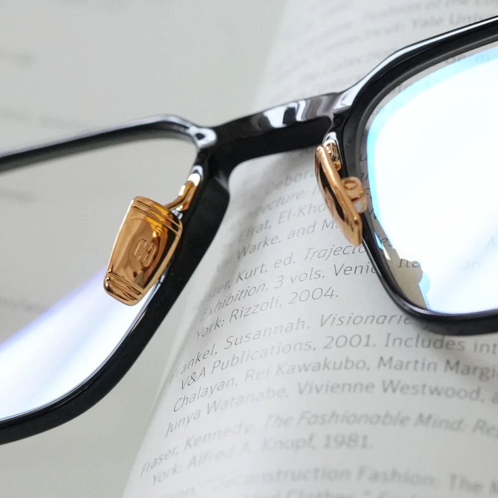 上品かつエッジの効いたスクエアシェイプ。非常にエレガントでスタイリッシュな雰囲気のメガネです。フロントも薄いアセテートプラスチックを使用し軽量に仕上げています。金属製パッド付きで掛け心地も良好です。ラグジュアリーな輝きがコンセプトの「オーラムコレクション」のアイウェアです。