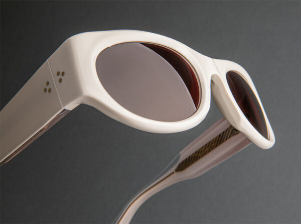 ホワイトは350本のみ生産の限定カラーで、ゴールドのリベット、テンプル芯に24金メッキが施された特別仕様です。ホワイトフレームにレッドブラウンのレンズもインパクト抜群のサングラスです。