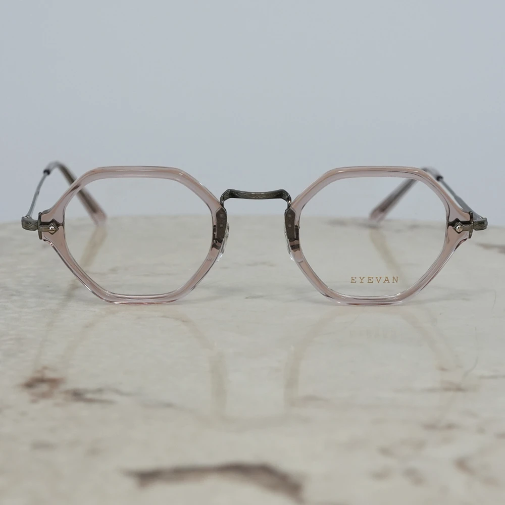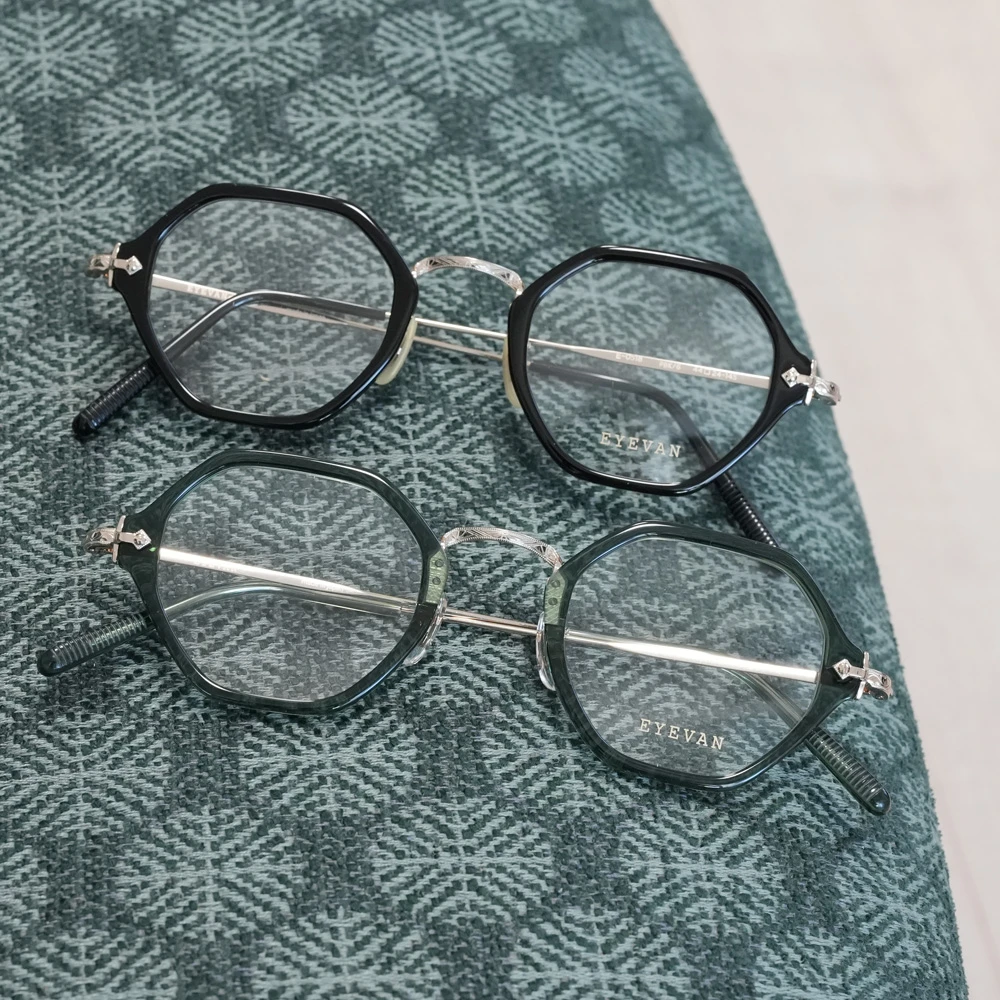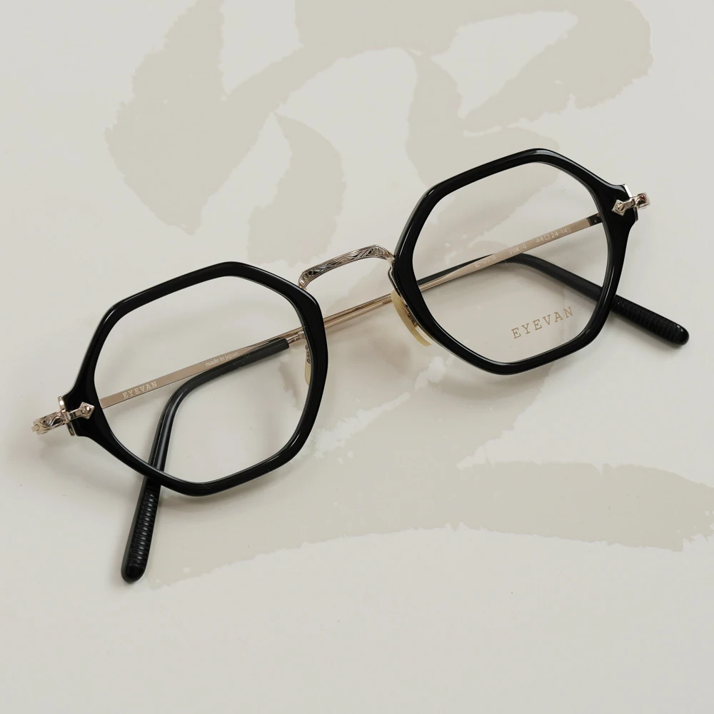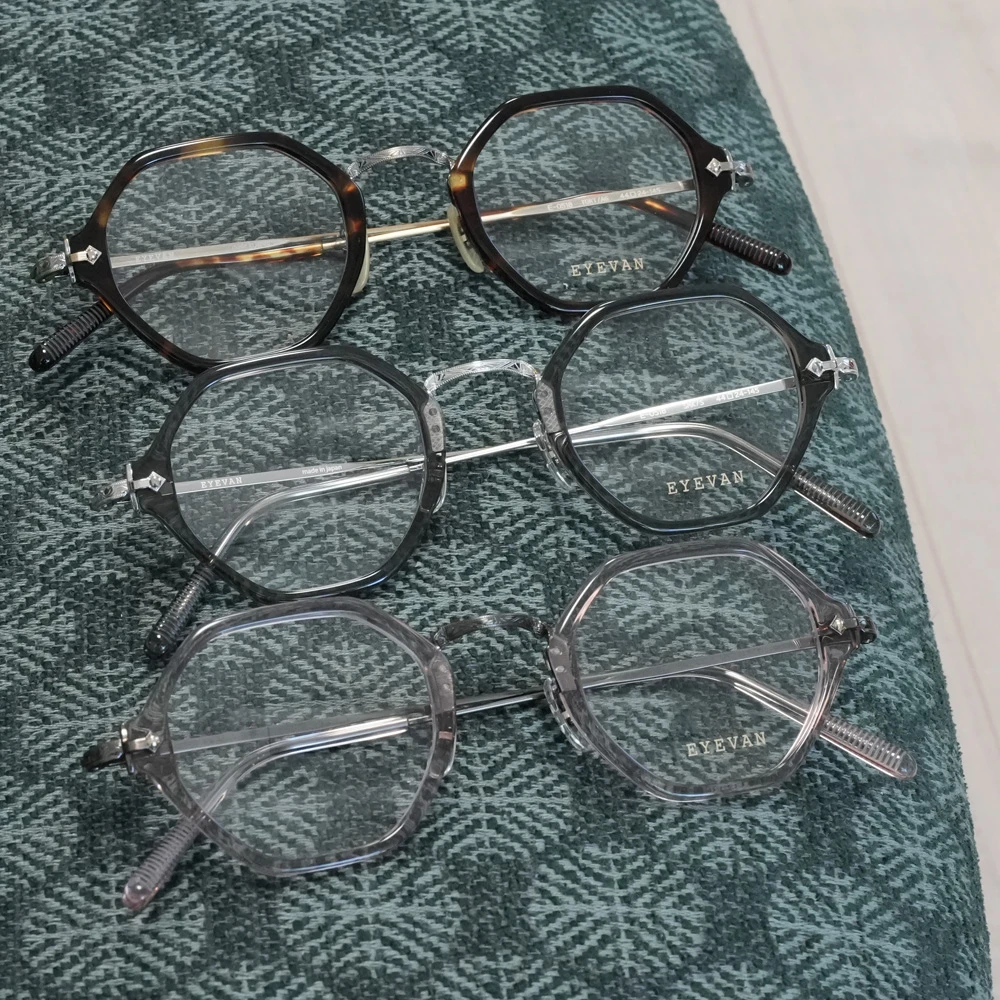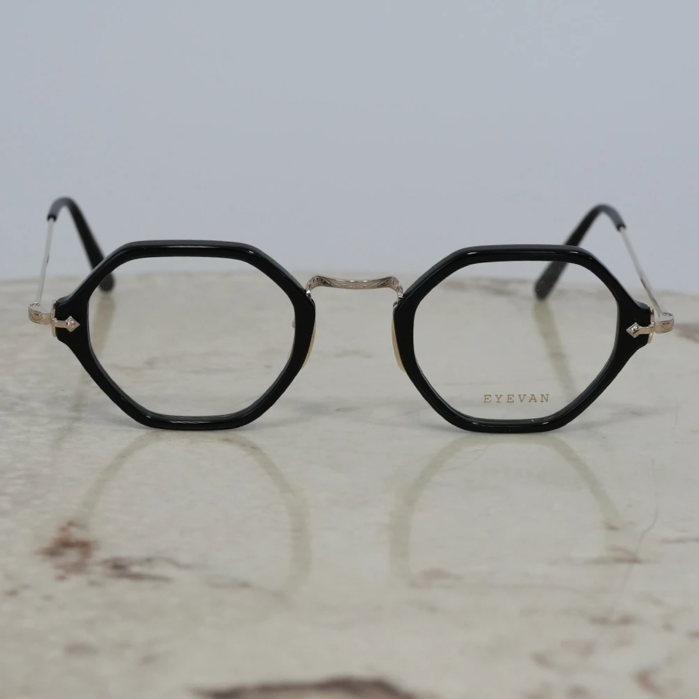 アイヴァンのカプセルコレクション、アイコン的存在であるE-500番台シリーズの系譜を継ぐコンビネーションフレーム。フロントは1980年代のアメリカンヴィンテージフレームから着想、小さいオクタゴン(八角形)型のレンズシェイプは小顔の方にお勧め。クリングス一体型のブリッジ、ブリッジやテンプルの繊細な刻印もアクセントとなっています。