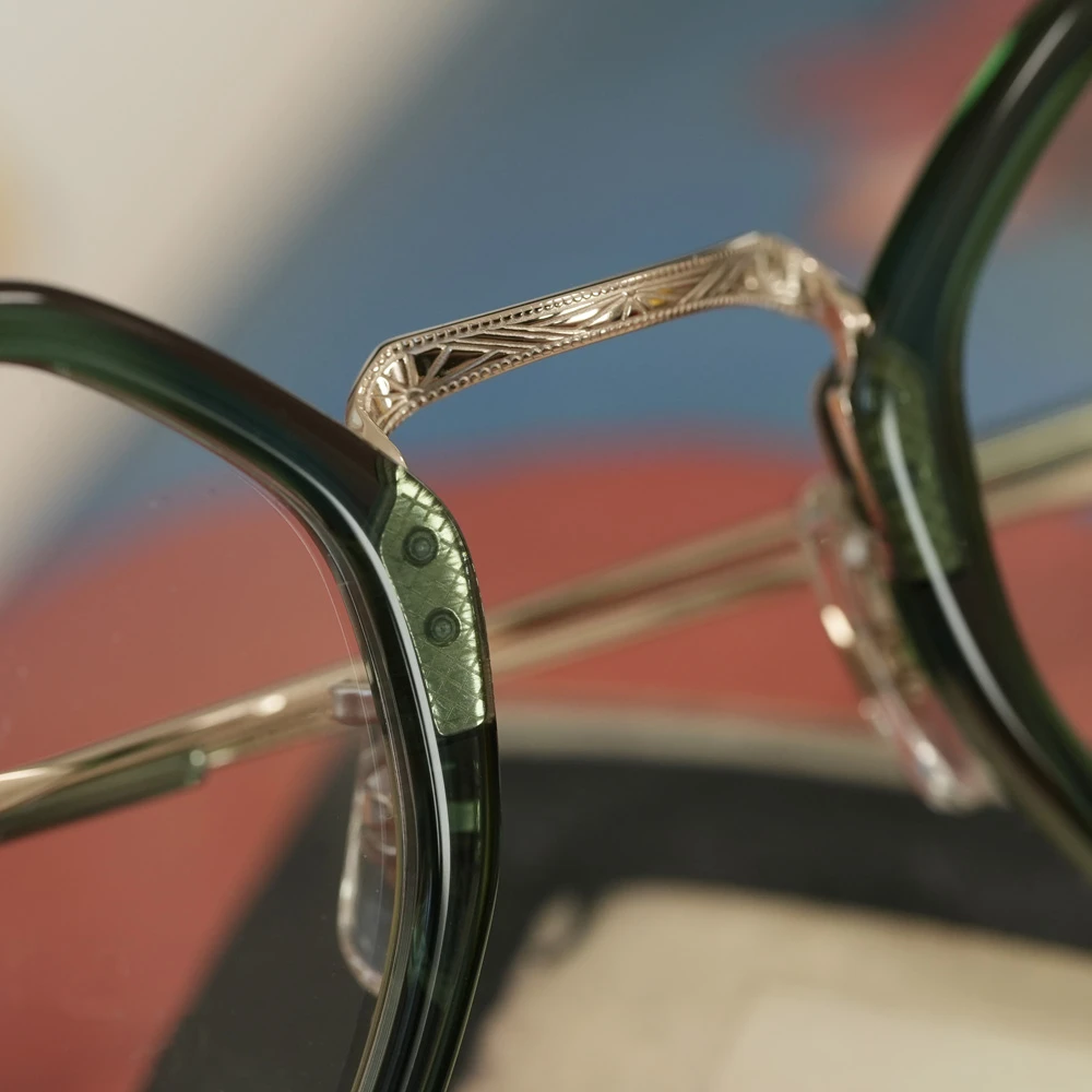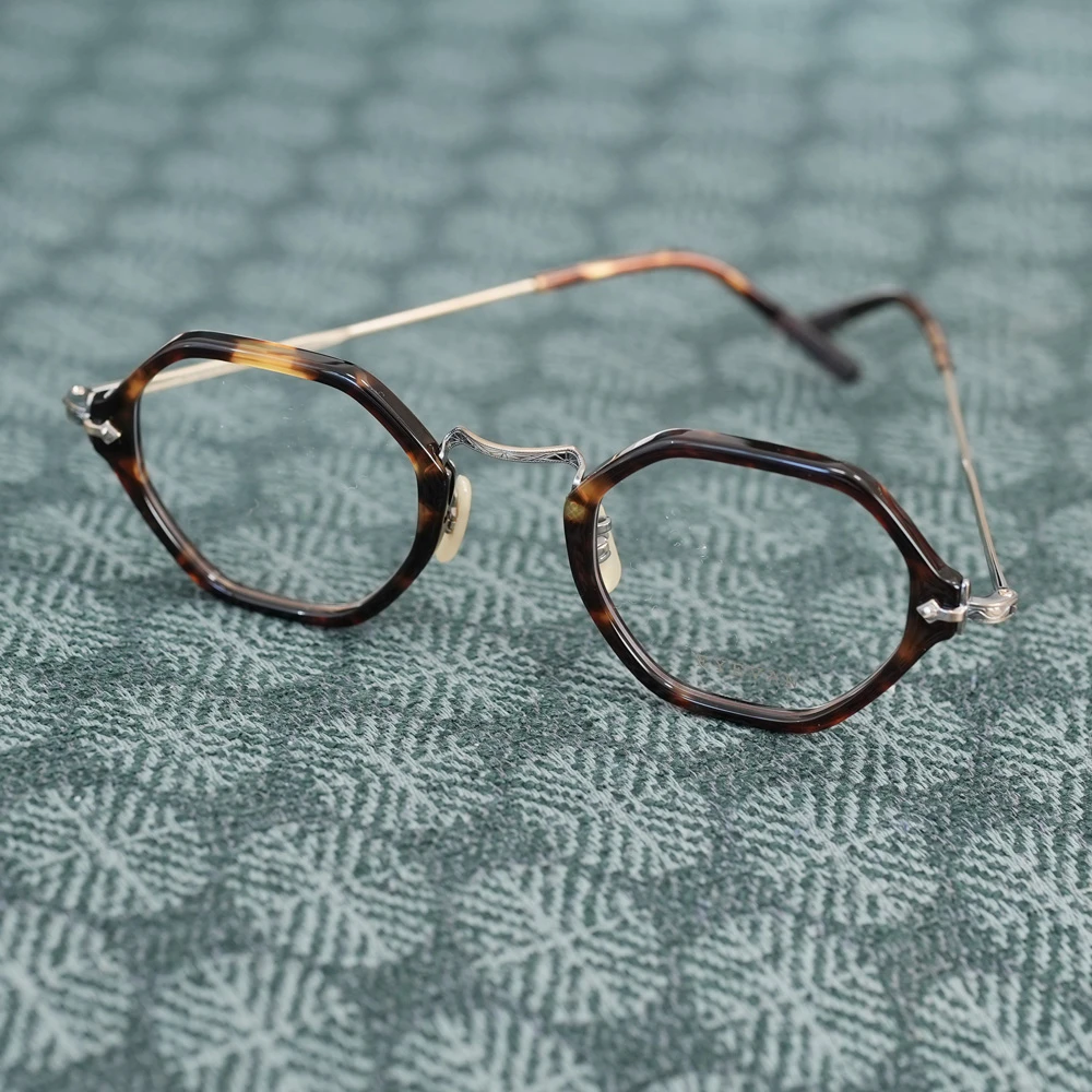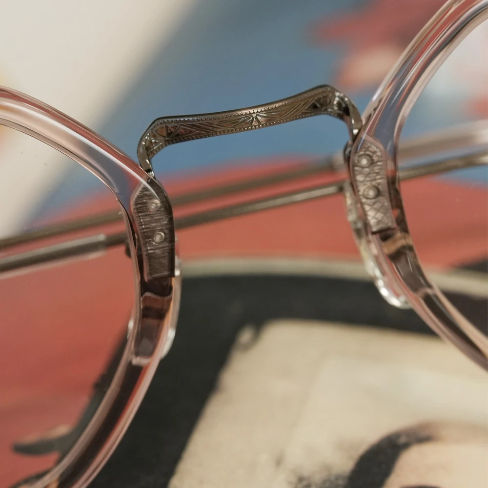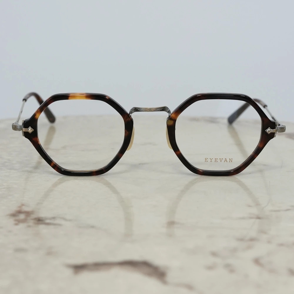 アイヴァンのカプセルコレクション、アイコン的存在であるE-500番台シリーズの系譜を継ぐコンビネーションフレーム。フロントは1980年代のアメリカンヴィンテージフレームから着想、小さいオクタゴン(八角形)型のレンズシェイプは小顔の方にお勧め。クリングス一体型のブリッジ、ブリッジやテンプルの繊細な刻印もアクセントとなっています。
