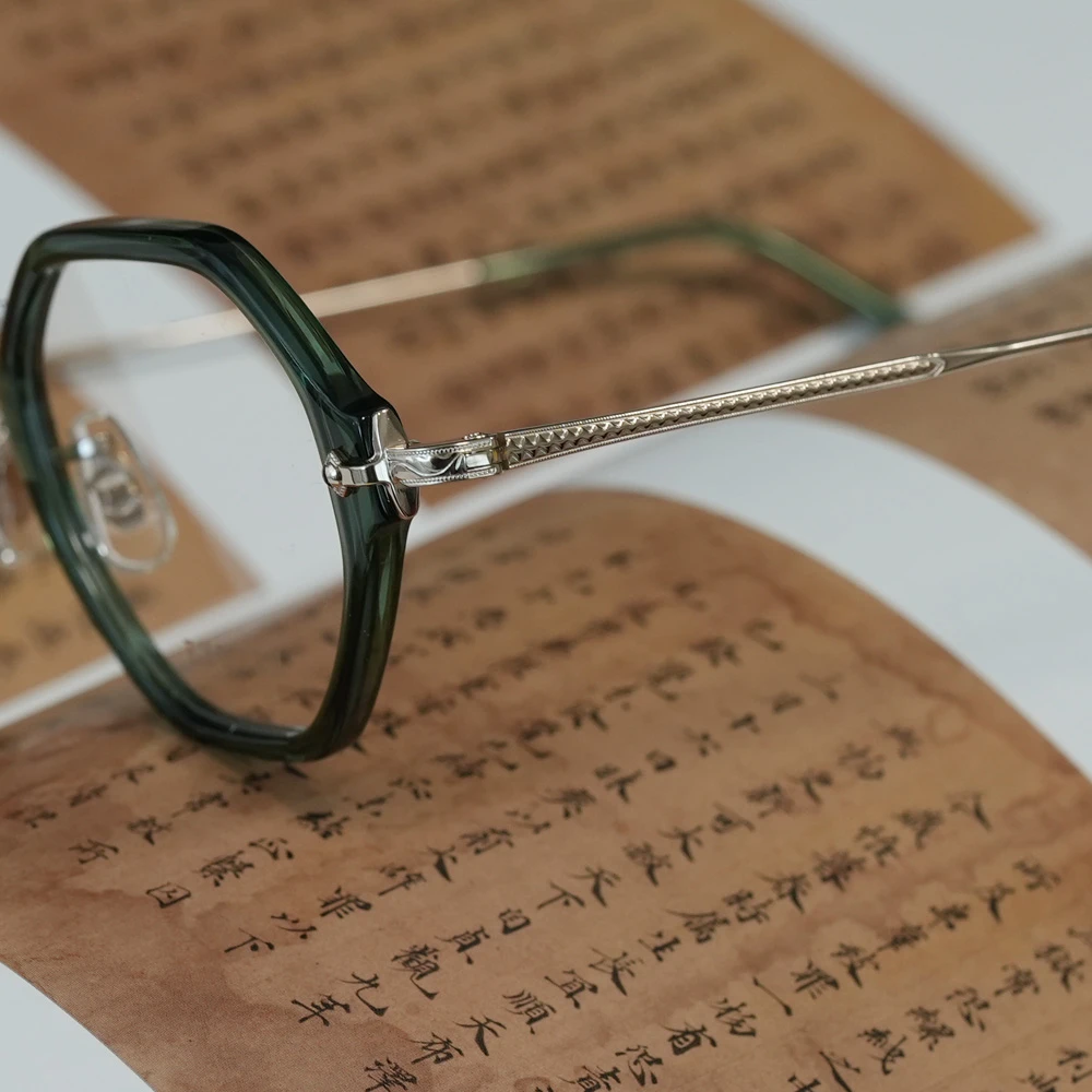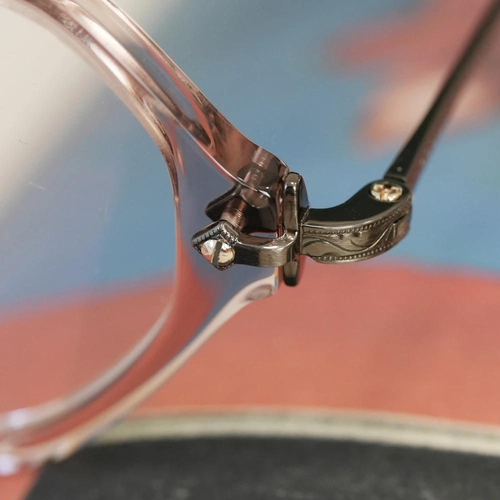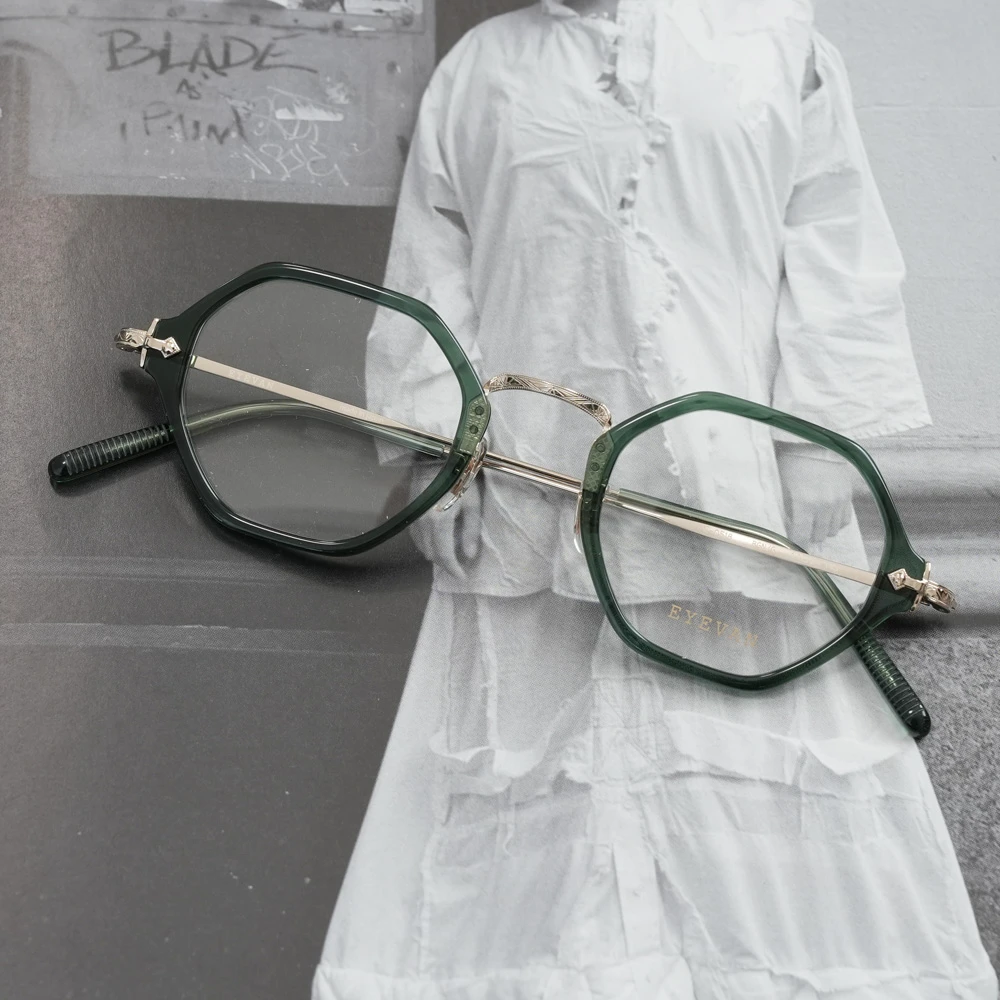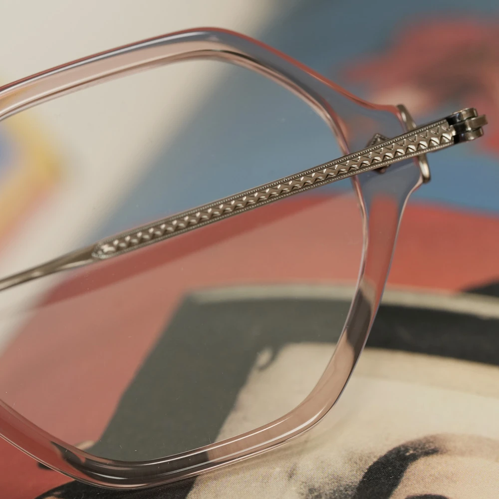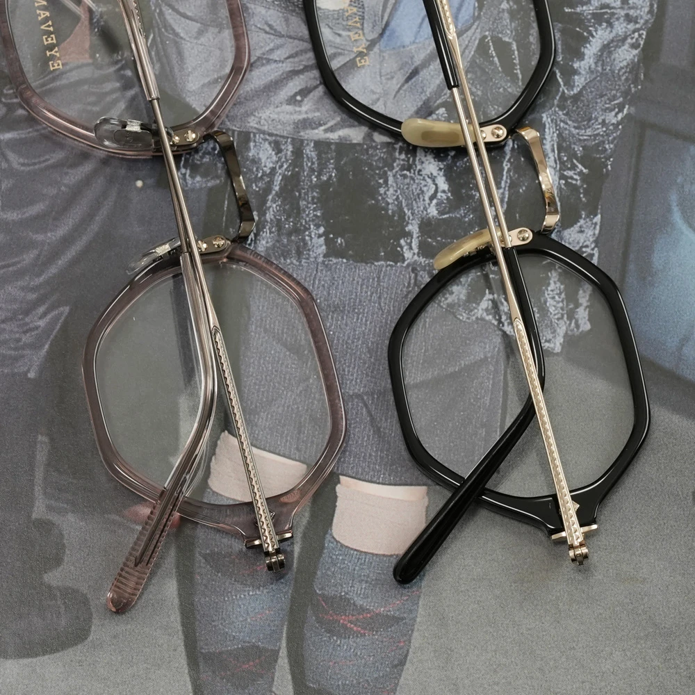 アイヴァンのカプセルコレクション、アイコン的存在であるE-500番台シリーズの系譜を継ぐコンビネーションフレーム。フロントは1980年代のアメリカンヴィンテージフレームから着想、小さいオクタゴン(八角形)型のレンズシェイプは小顔の方にお勧め。クリングス一体型のブリッジ、ブリッジやテンプルの繊細な刻印もアクセントとなっています。