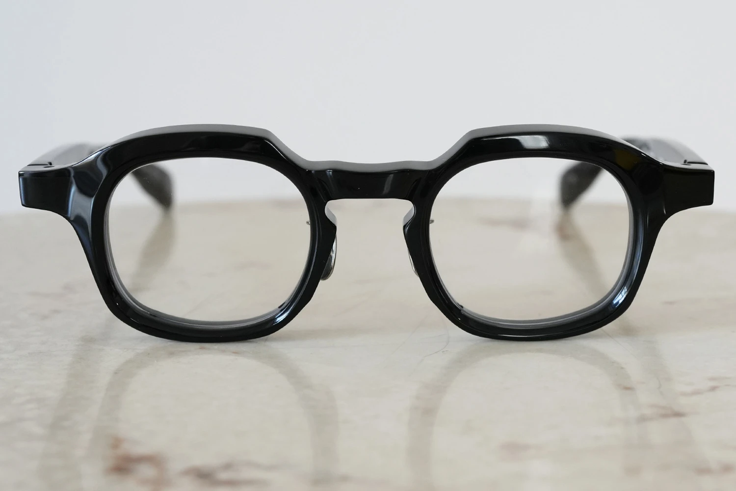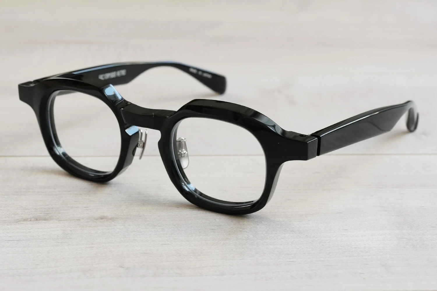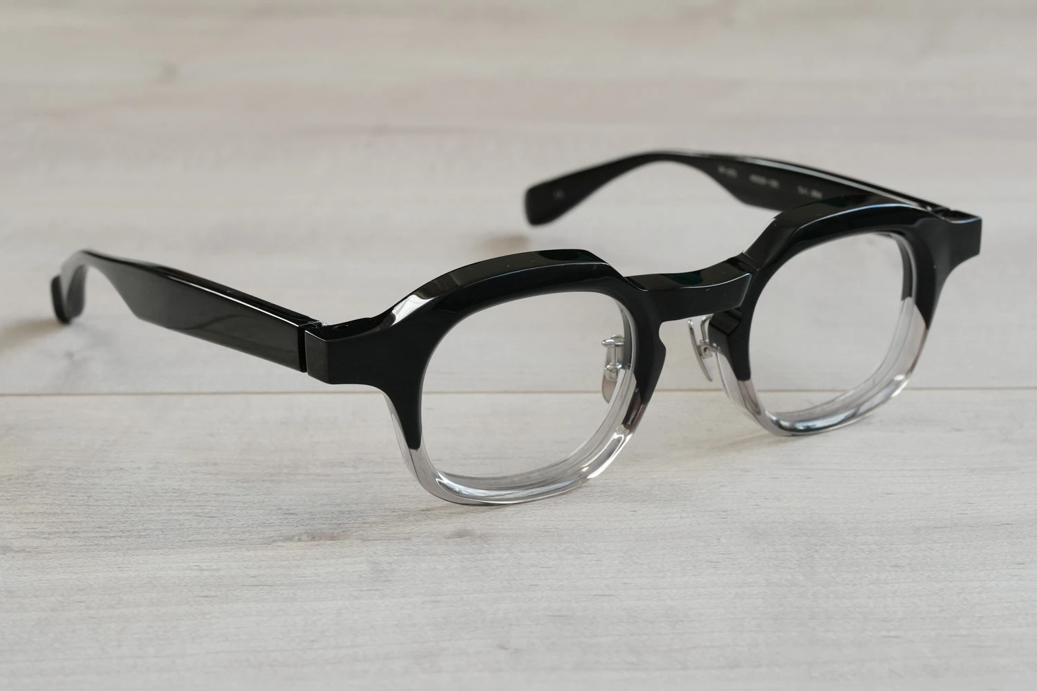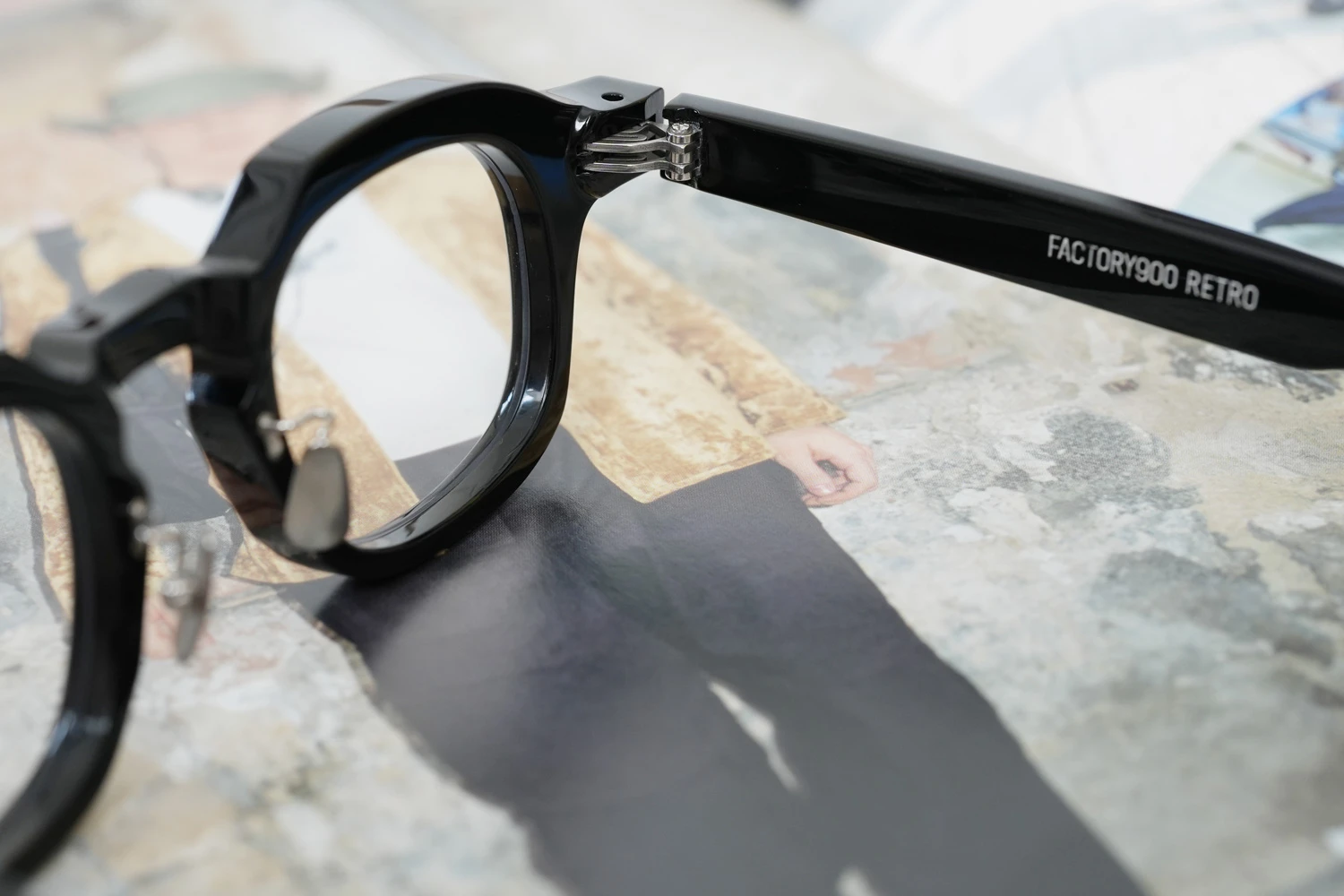 ファクトリー900レトロの中ではベーシックなスクエアフレーム。一見シンプルではありますが、ブリッジ付近のラインが独特、やや大きめのサイズ感も新鮮です。8mm厚のフロント面には内面カットを施しフラットに見えるフロントにも立体感が感じられるよう作り込まれています。テンプルが外側に広がるバネ蝶番、金属製の鼻パッド付きで掛け心地の良さも魅力的です。 size:レンズ横幅45mm 縦幅38mm レンズ間距離26mm フロント幅149mm