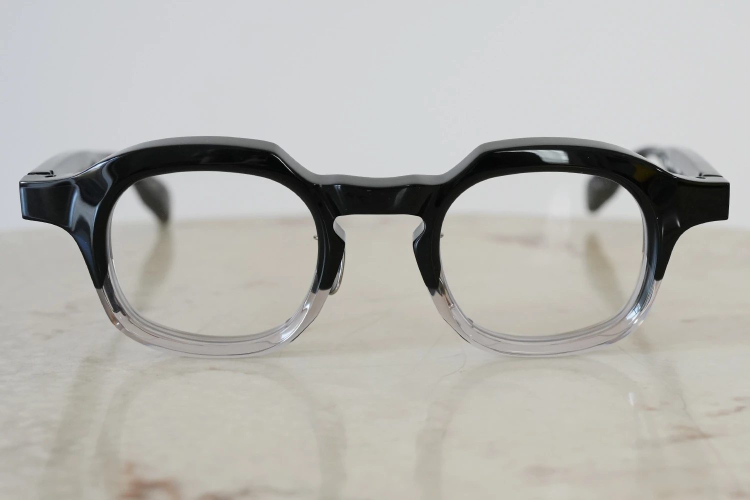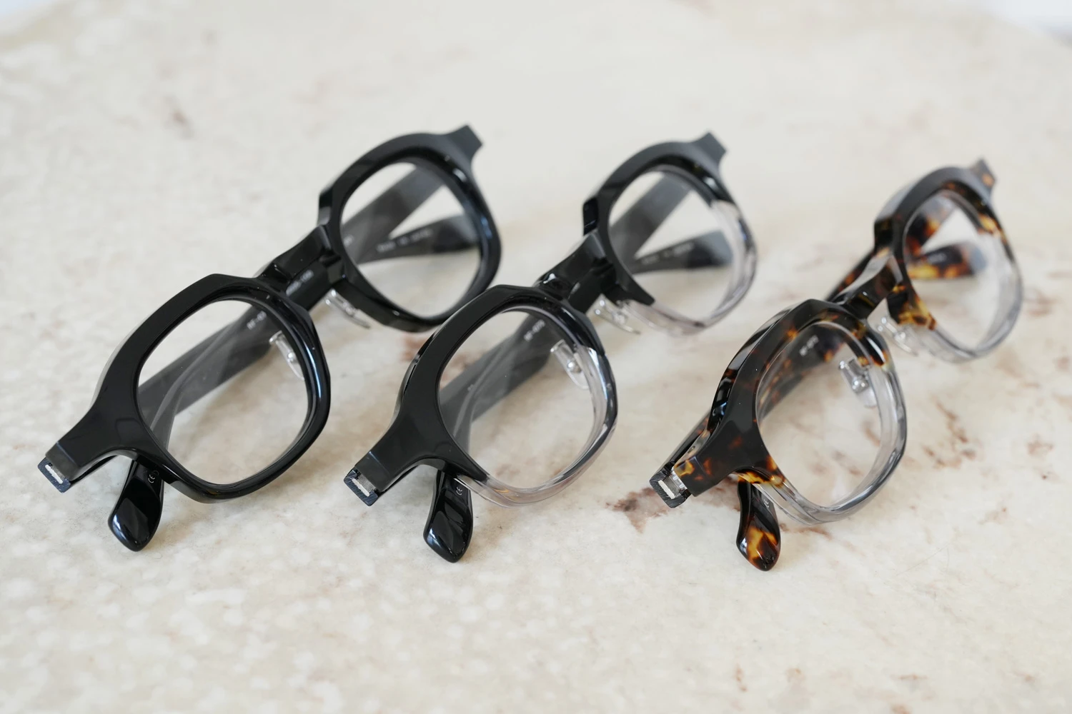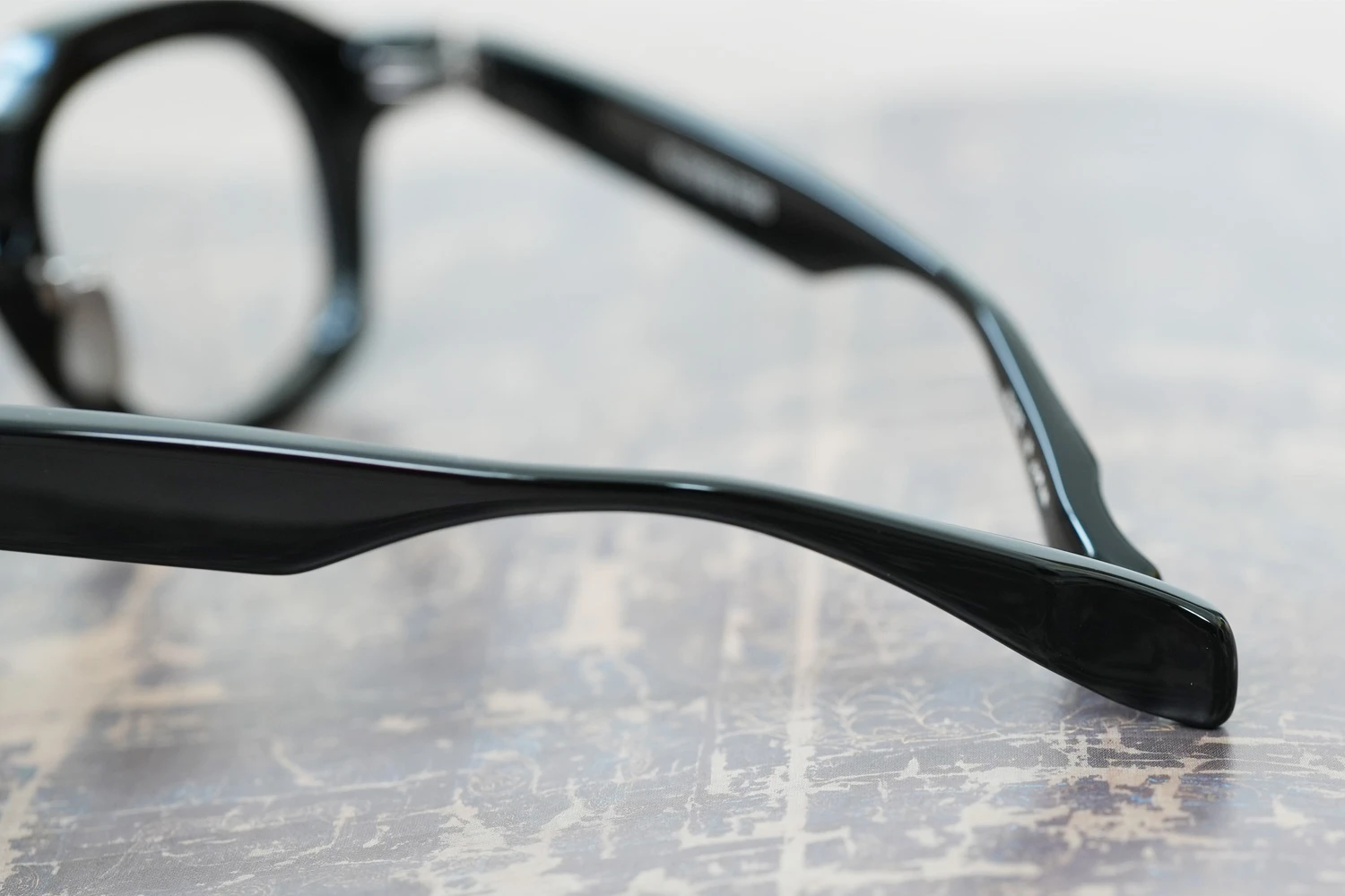 ファクトリー900レトロの中ではベーシックなスクエアフレーム。一見シンプルではありますが、ブリッジ付近のラインが独特、やや大きめのサイズ感も新鮮です。8mm厚のフロント面には内面カットを施しフラットに見えるフロントにも立体感が感じられるよう作り込まれています。テンプルが外側に広がるバネ蝶番、金属製の鼻パッド付きで掛け心地の良さも魅力的です。 size:レンズ横幅45mm 縦幅38mm レンズ間距離26mm フロント幅149mm
