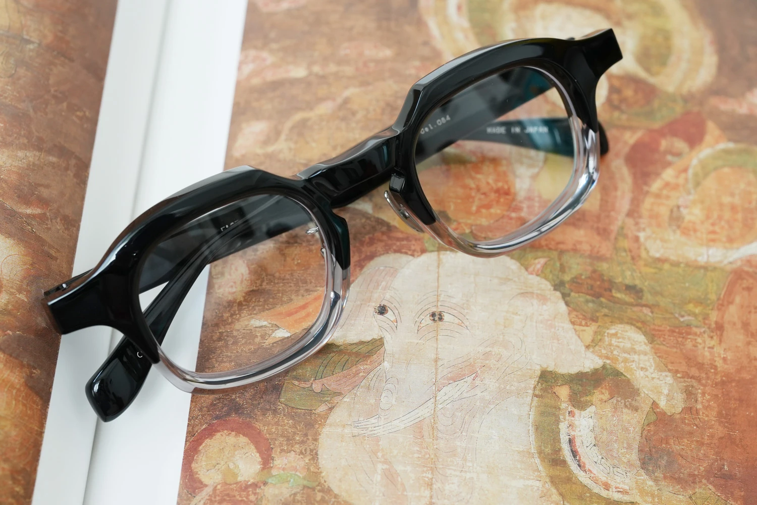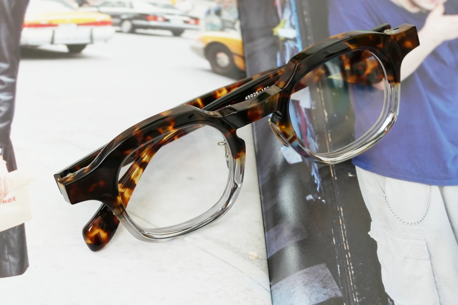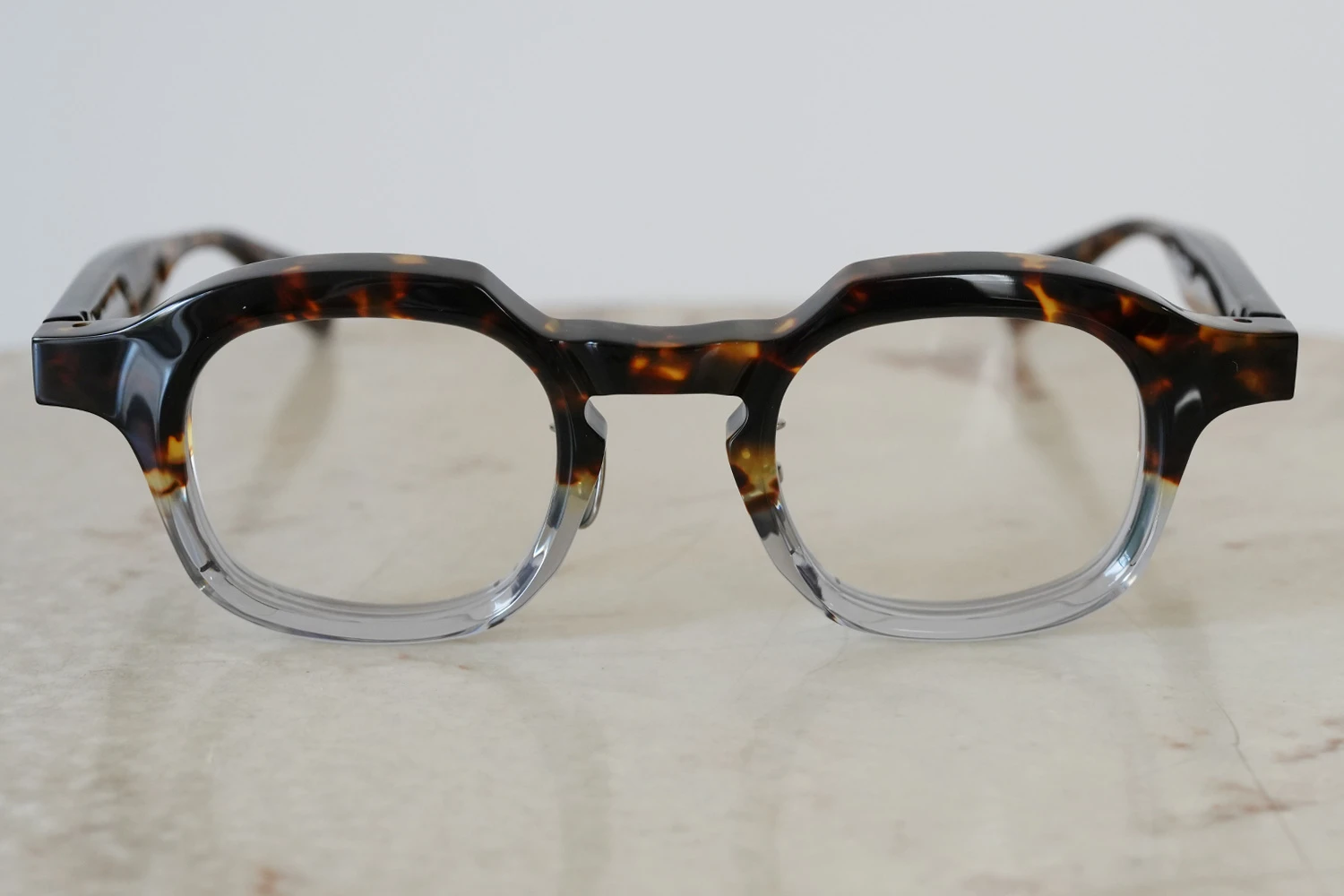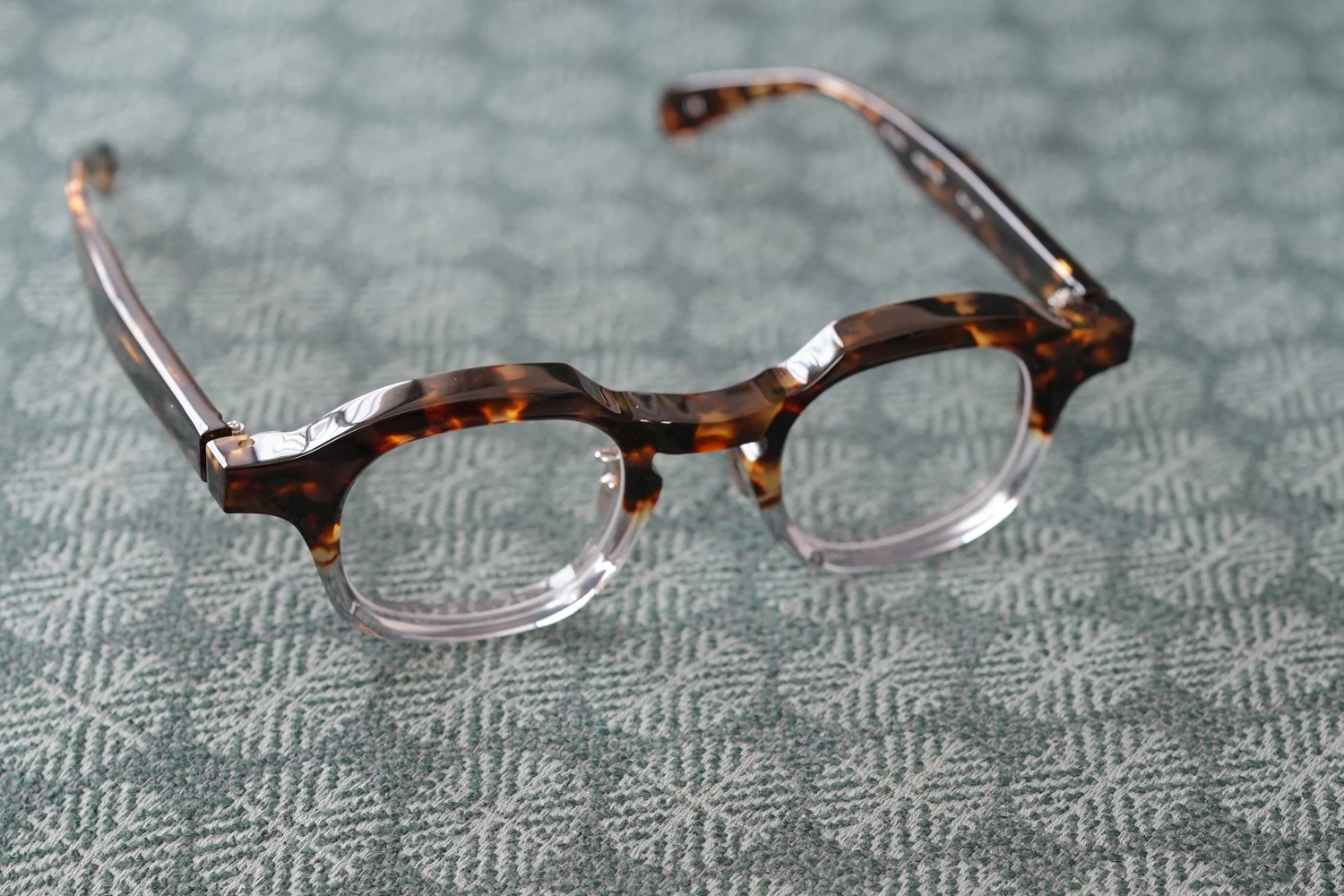 ファクトリー900レトロの中ではベーシックなスクエアフレーム。一見シンプルではありますが、ブリッジ付近のラインが独特、やや大きめのサイズ感も新鮮です。8mm厚のフロント面には内面カットを施しフラットに見えるフロントにも立体感が感じられるよう作り込まれています。テンプルが外側に広がるバネ蝶番、金属製の鼻パッド付きで掛け心地の良さも魅力的です。 size:レンズ横幅45mm 縦幅38mm レンズ間距離26mm フロント幅149mm