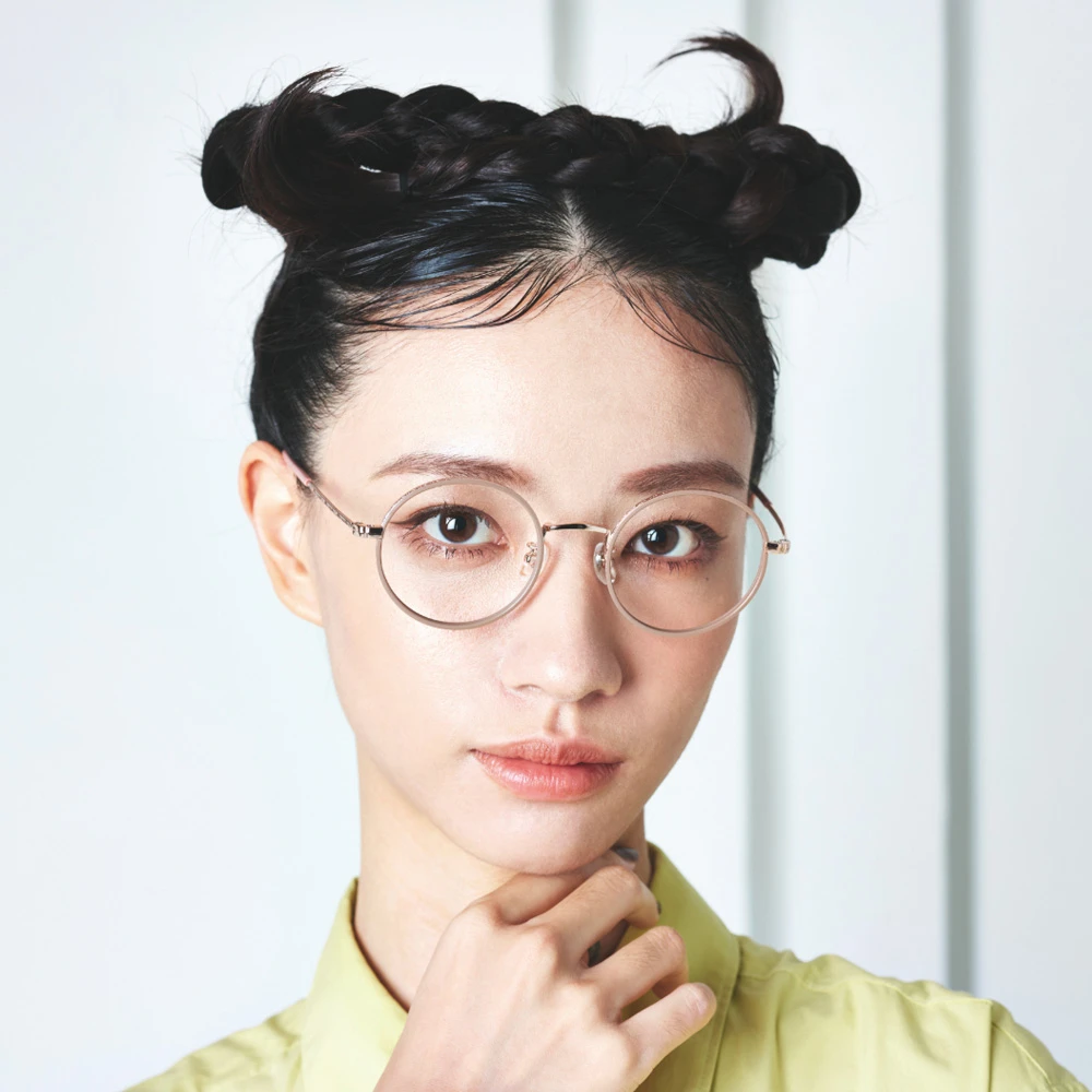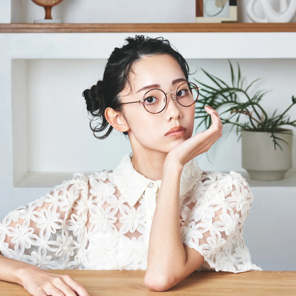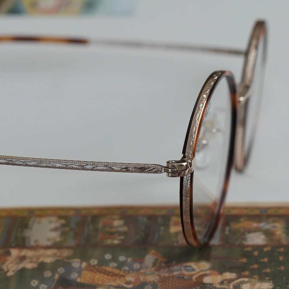 メタルリムにプラスチック素材のインナーリムを組み合わせたニュアンスのあるラウンドフレーム。テンプルには繊細な植物柄が刻印が施されており高級感も感じられます。軽量で掛け心地の良さも魅力的です。