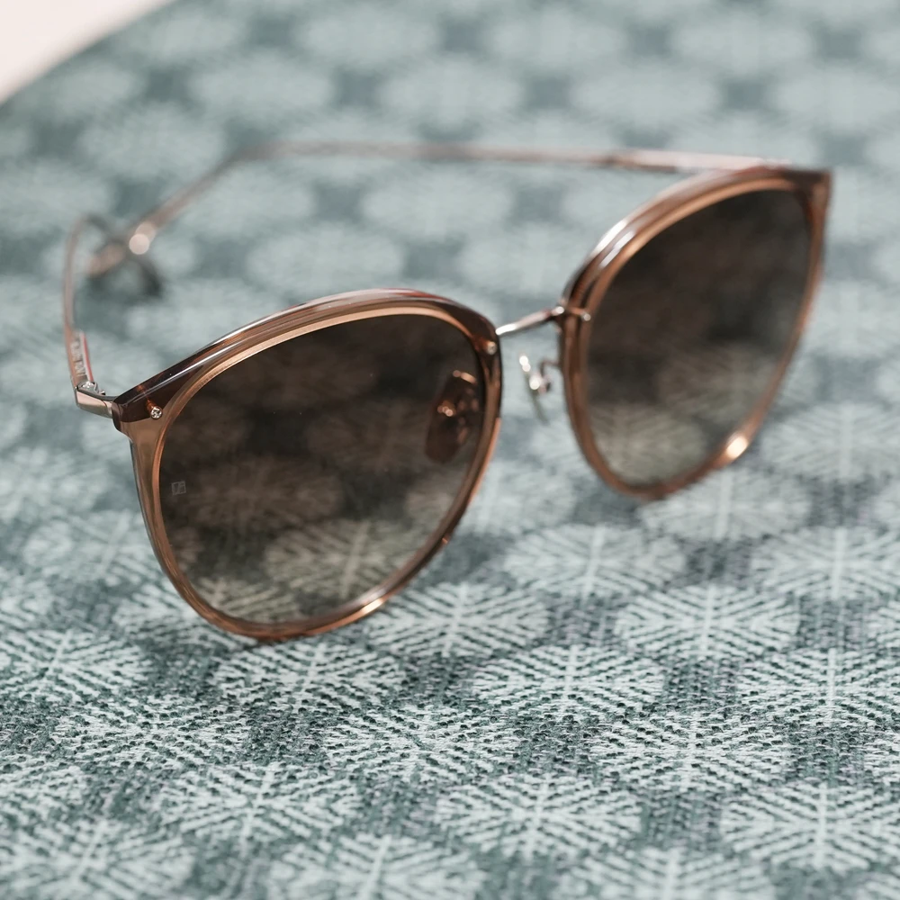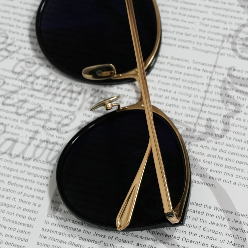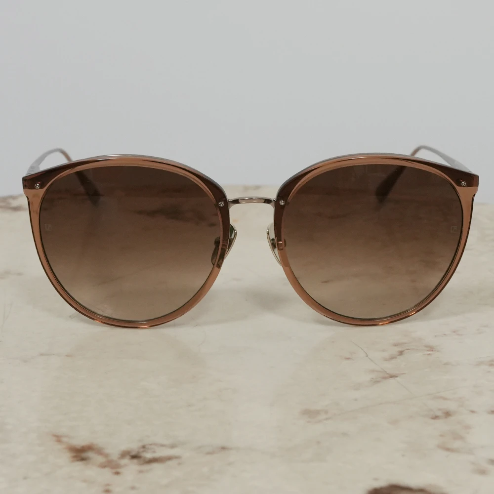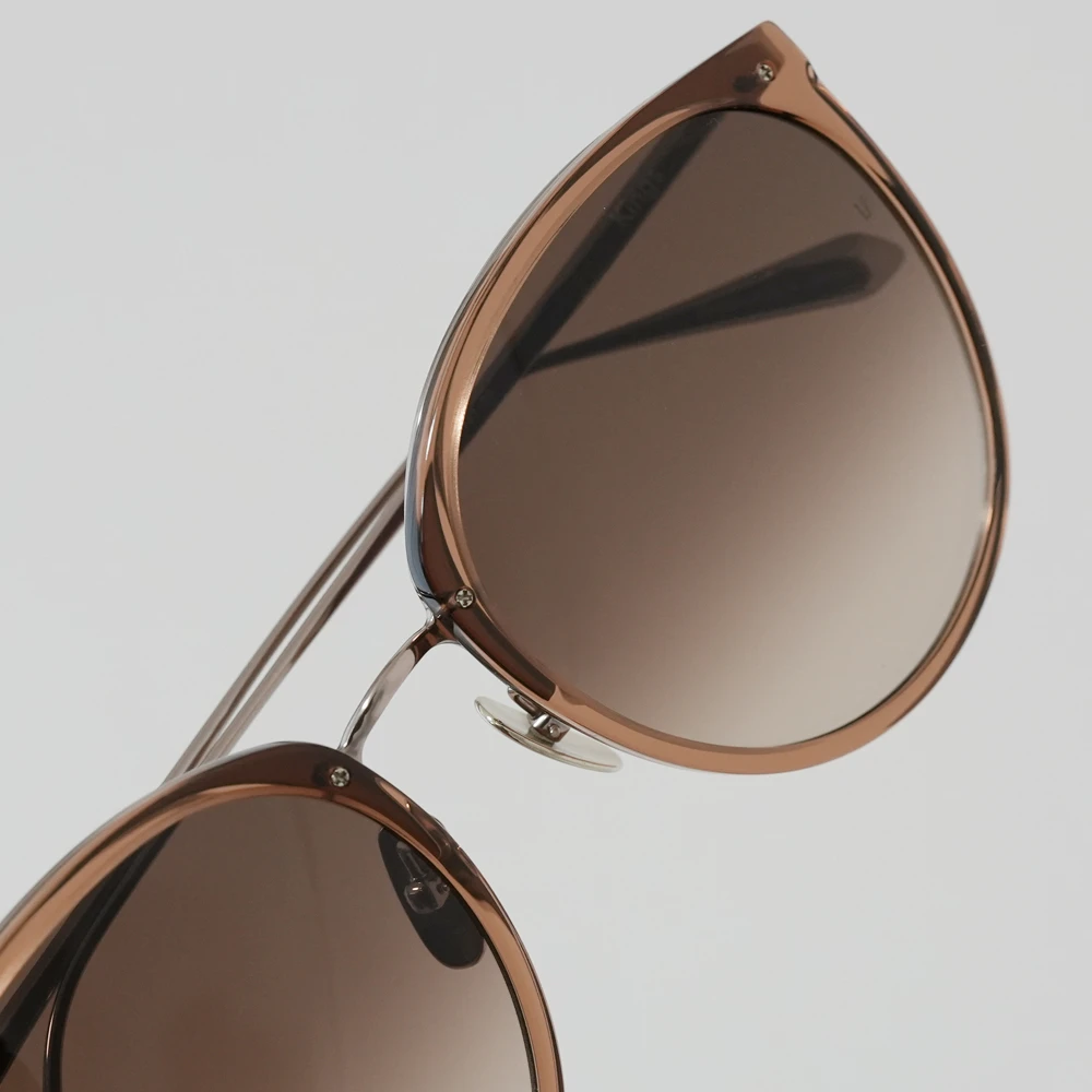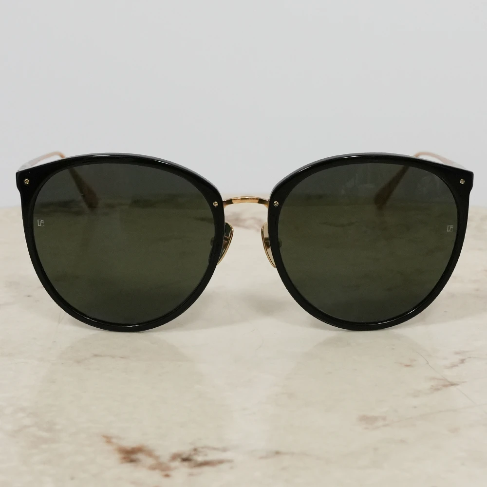リンダファロー定番の超ビッグサイズのパントシェイプのコンビネーションフレーム。クリアレンズに交換してメガネとしての着用もお勧め、軽量で掛け心地の良さも魅力的です。右テンプル上部に「LINDA FARROW」のロゴ、立体感のあるモダンエンドなど見えない部分まで高級感が感じられるデザインです。