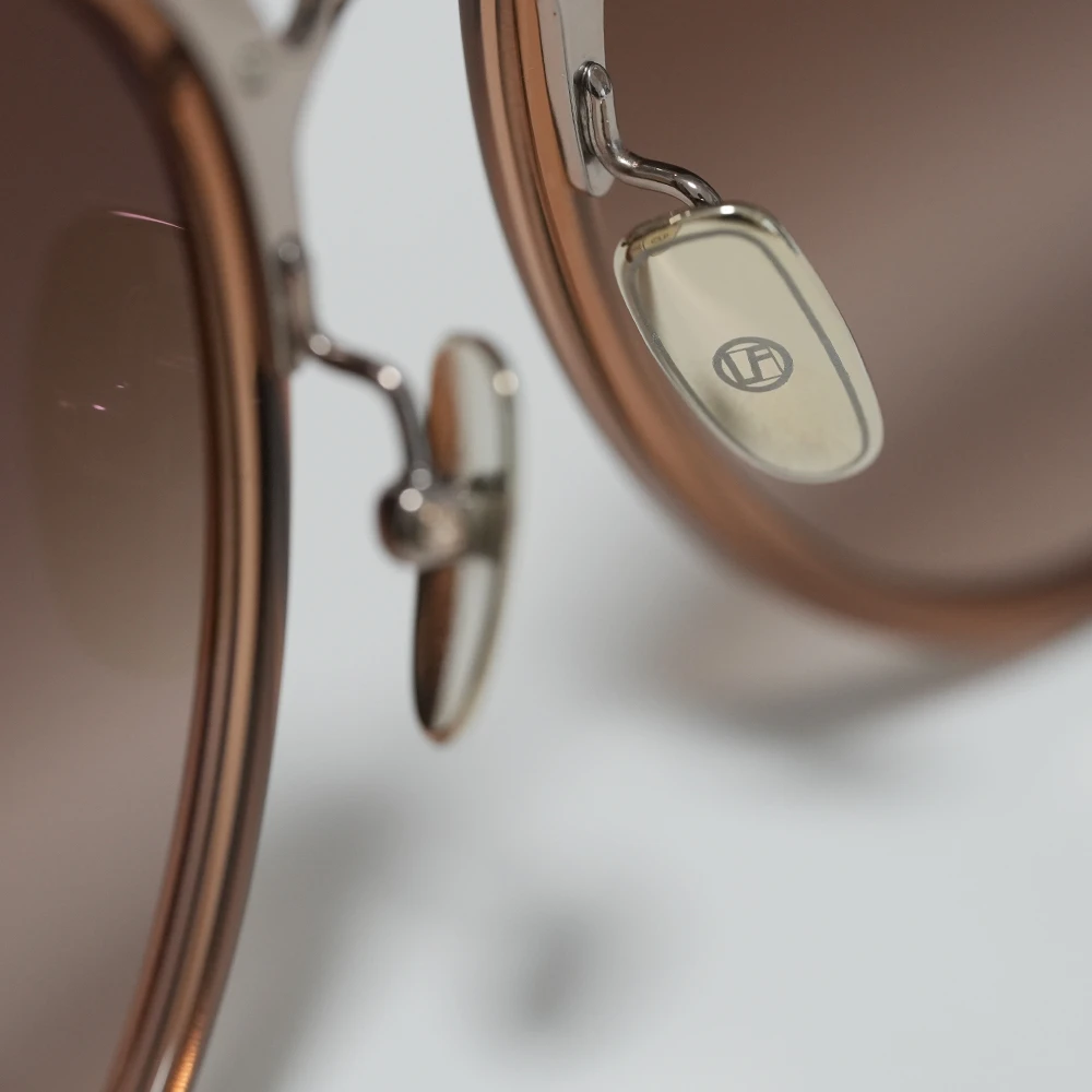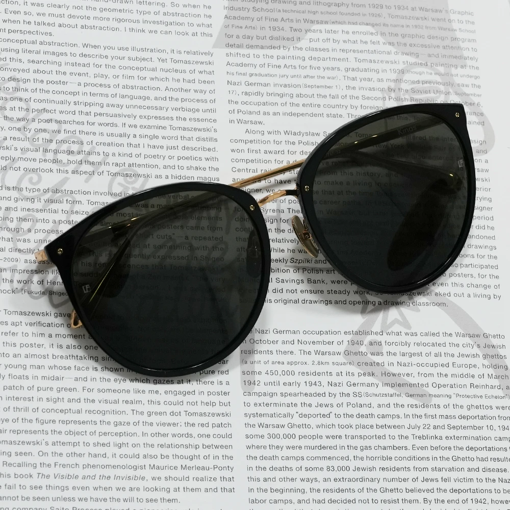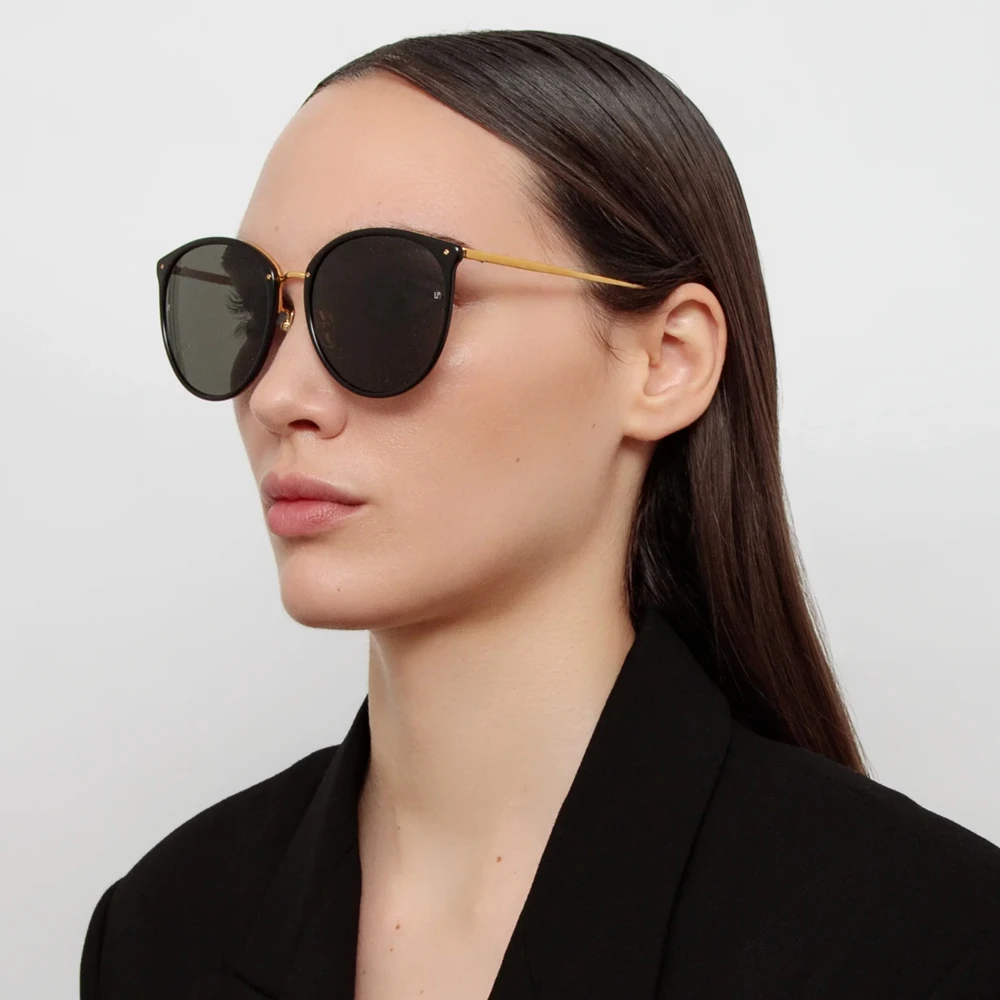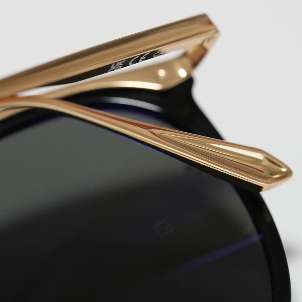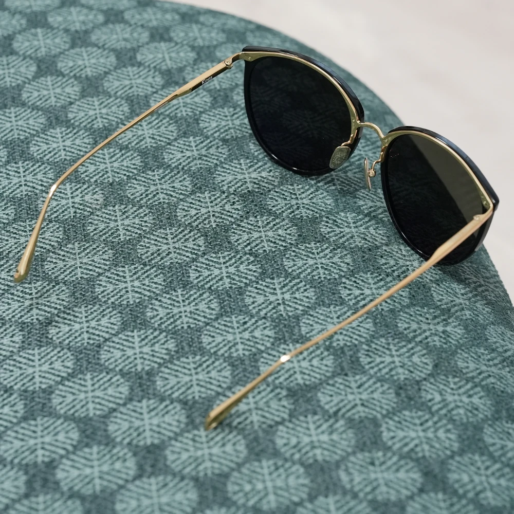 リンダファロー定番の超ビッグサイズのパントシェイプのコンビネーションフレーム。クリアレンズに交換してメガネとしての着用もお勧め、軽量で掛け心地の良さも魅力的です。右テンプル上部に「LINDA FARROW」のロゴ、立体感のあるモダンエンドなど見えない部分まで高級感が感じられるデザインです。
