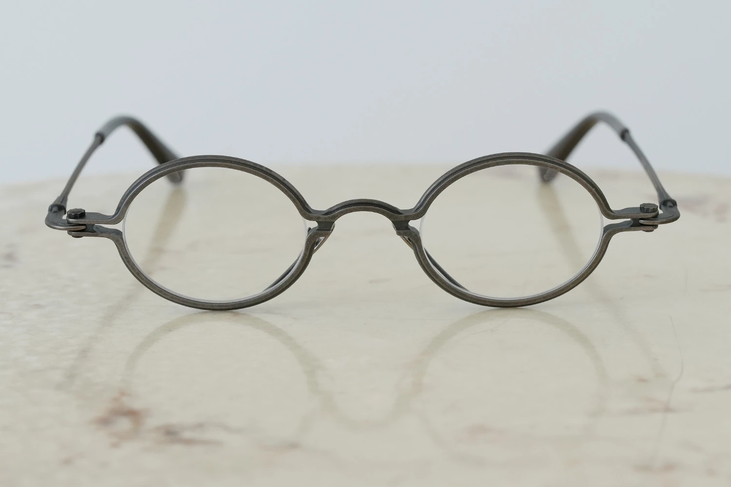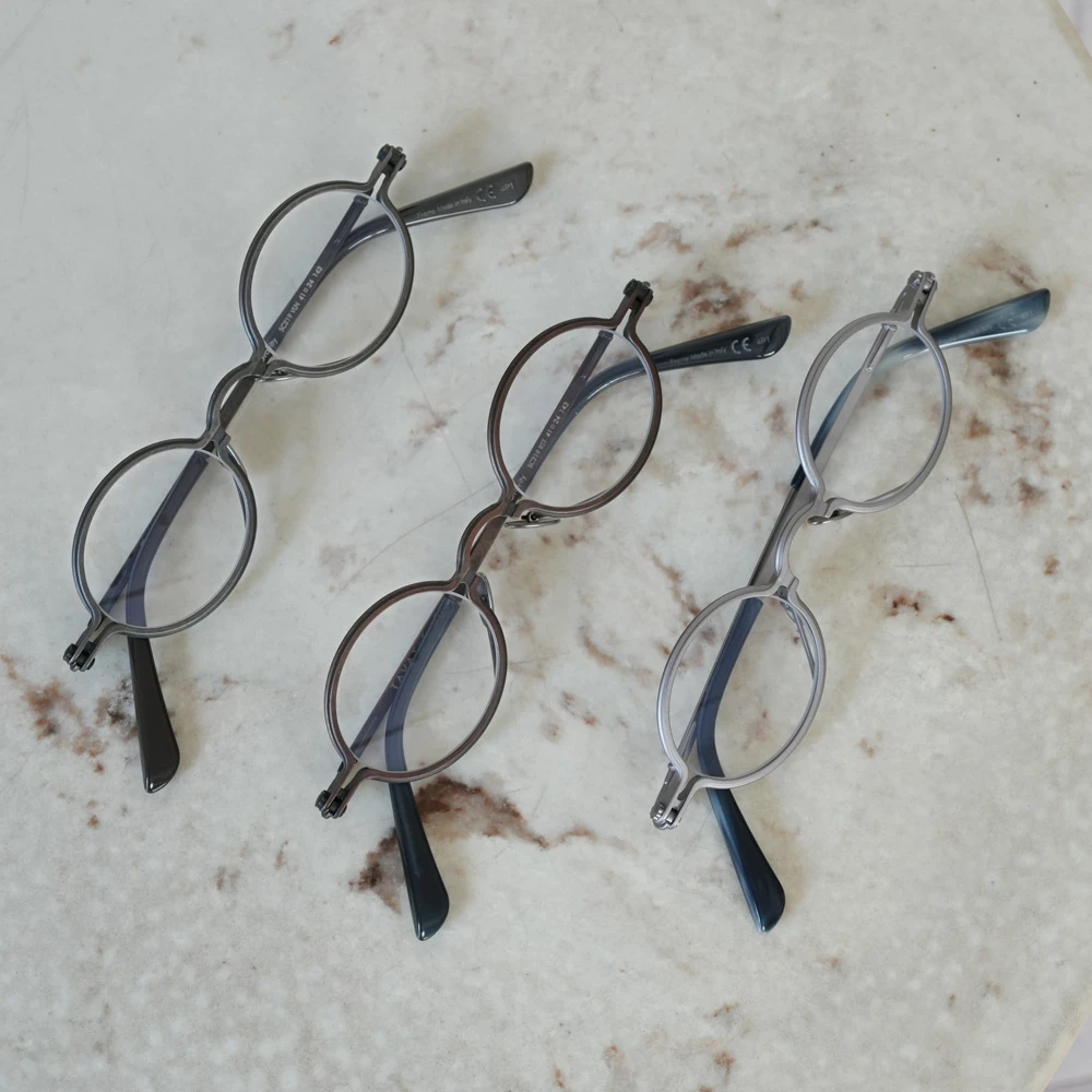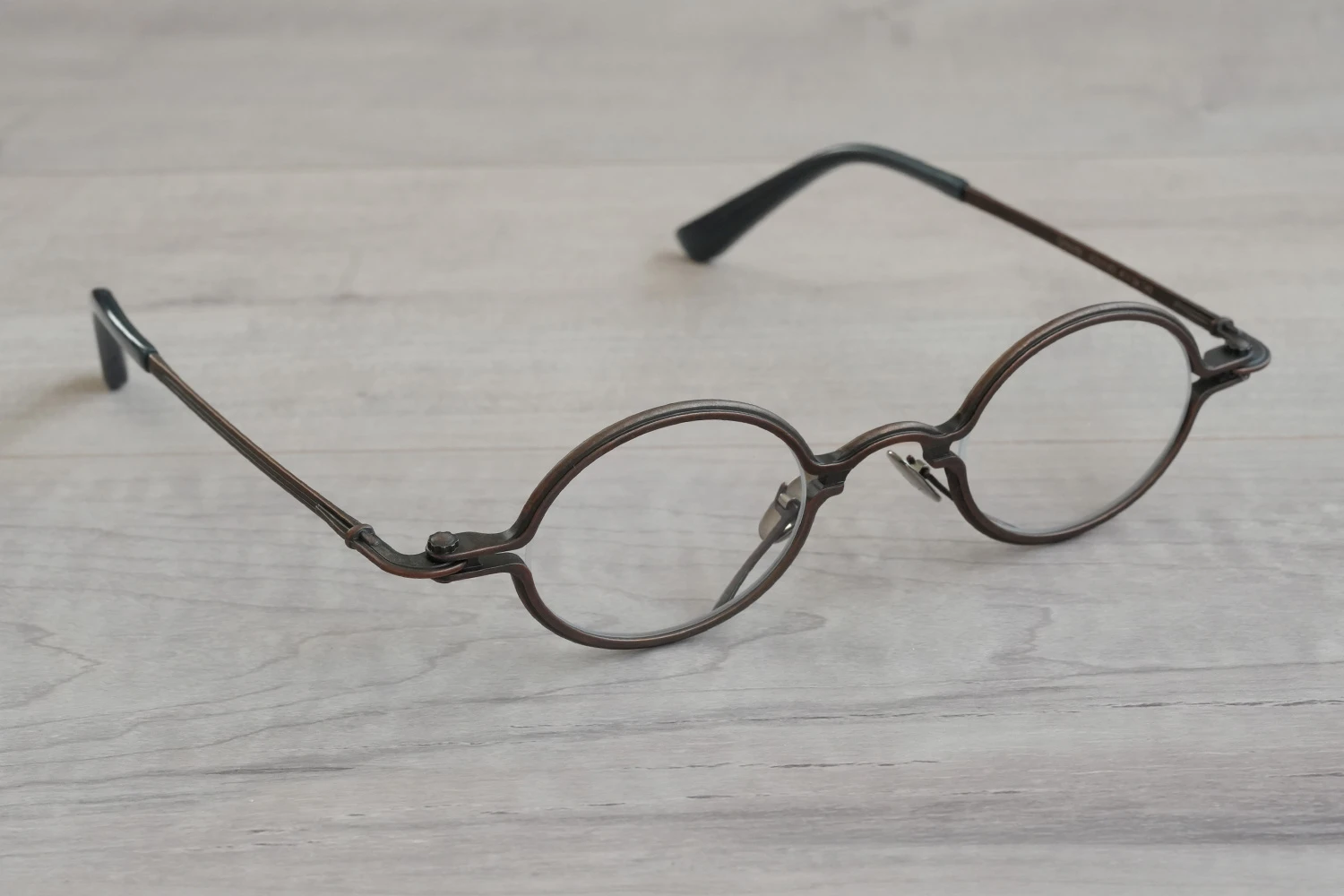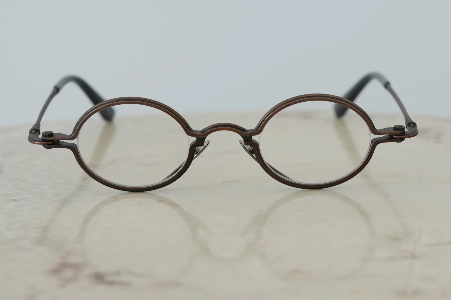 独特の構造と通常のメタルフレームにはない存在感が魅力の「SOUPCAN(スープカン)」コレクションの小さいオーバルフレーム。レンズ横幅40mmと小さいサイズですが、フレーム全体の横幅は大きく、多くの人にご好評いただいております。銅合金を使用しており、アンティーク調の力強いカラーリング、蝶番ネジに時計の竜頭を使用しているのも特徴です。フロント下方から飛び出たユニークなクリングスパッドの先端部は可動域が広く、鼻に自然に添う仕様となっています。