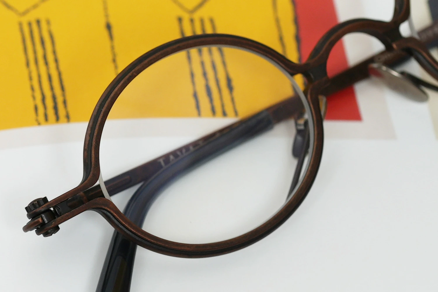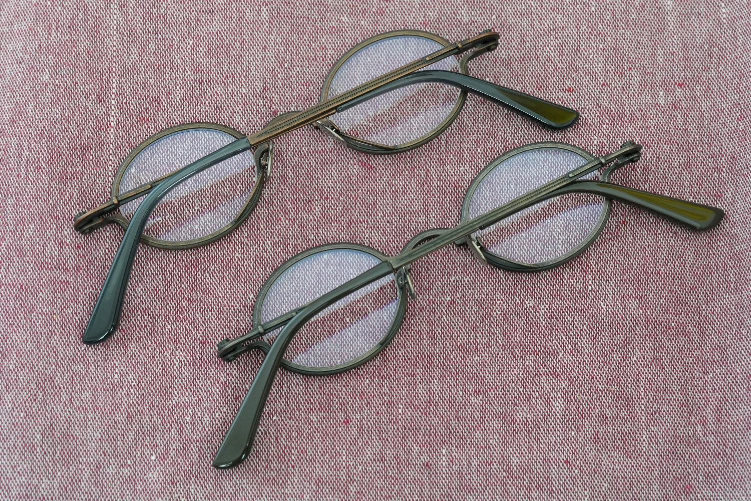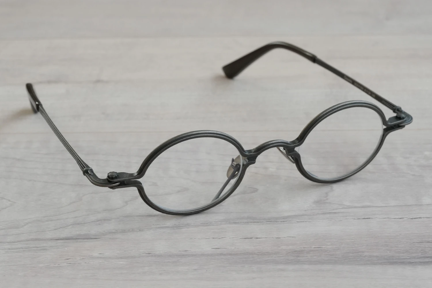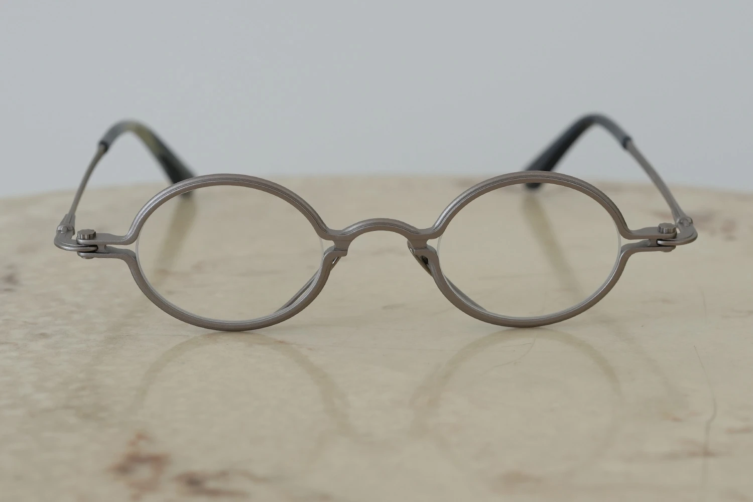 独特の構造と通常のメタルフレームにはない存在感が魅力の「SOUPCAN(スープカン)」コレクションの小さいオーバルフレーム。レンズ横幅40mmと小さいサイズですが、フレーム全体の横幅は大きく、多くの人にご好評いただいております。銅合金を使用しており、アンティーク調の力強いカラーリング、蝶番ネジに時計の竜頭を使用しているのも特徴です。フロント下方から飛び出たユニークなクリングスパッドの先端部は可動域が広く、鼻に自然に添う仕様となっています。