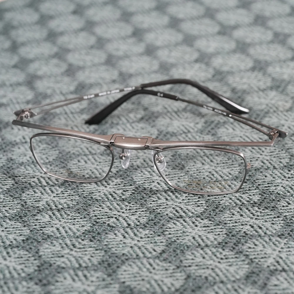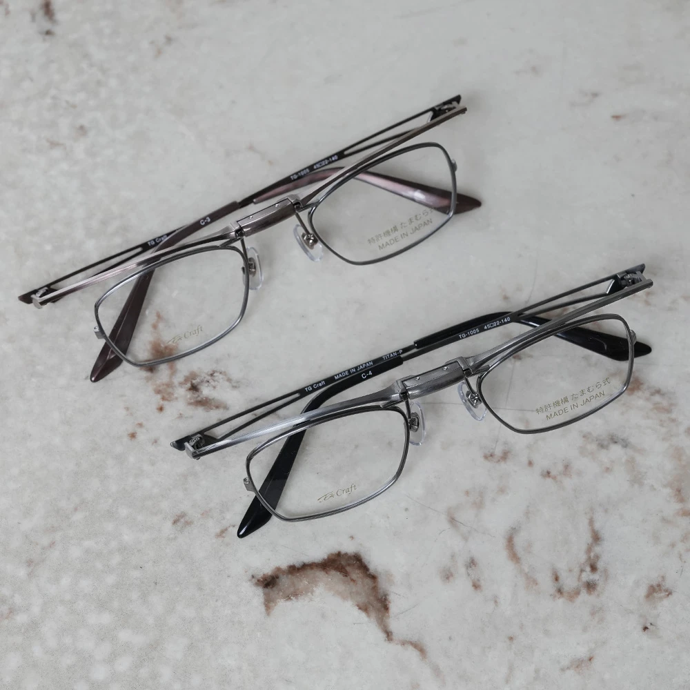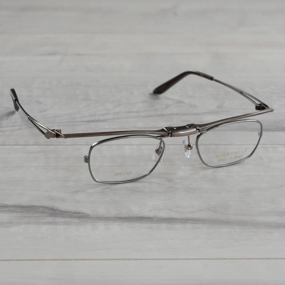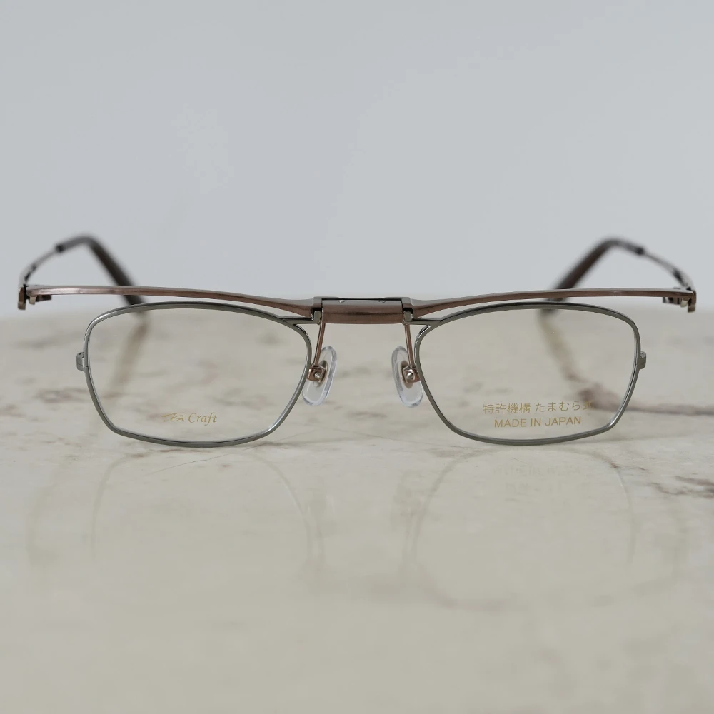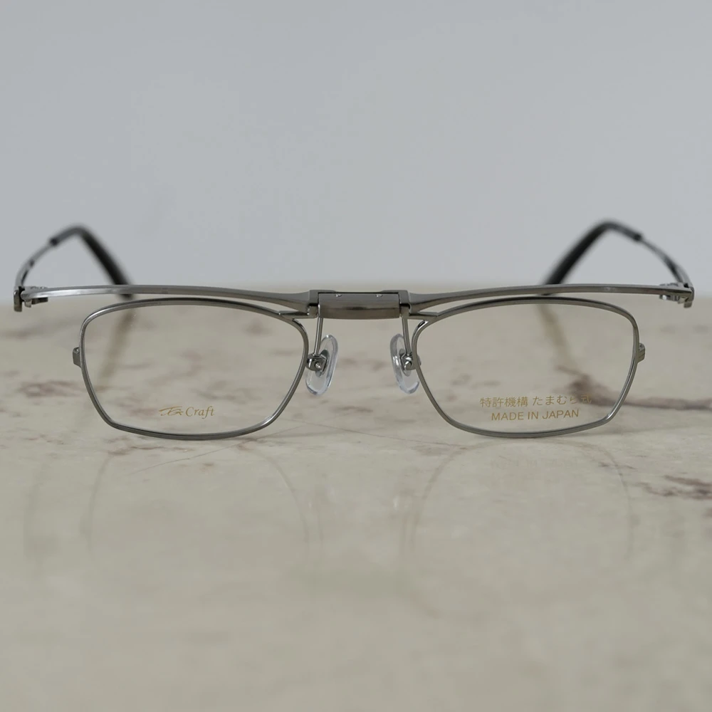 創業約40年の福井県の眼鏡製造会社「たまむら眼鏡」のオリジナルブランド「TGクラフト」の跳ね上げメガネ。特許取得の緩みにくく、ワンタッチで跳ね上がるオリジナルの機構を採用した小さいスクエアフレーム。チタン素材を使用しており非常に軽量で掛け心地が良いのも魅力です。今までの跳ね上げメガネには無かった小さいサイズ、お顔の小さい方や女性にお勧め、また強度近視の方にも最適です。