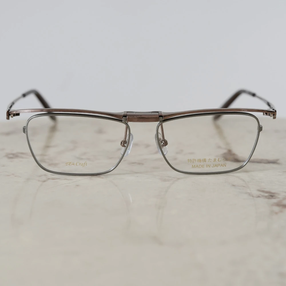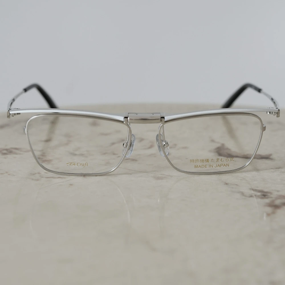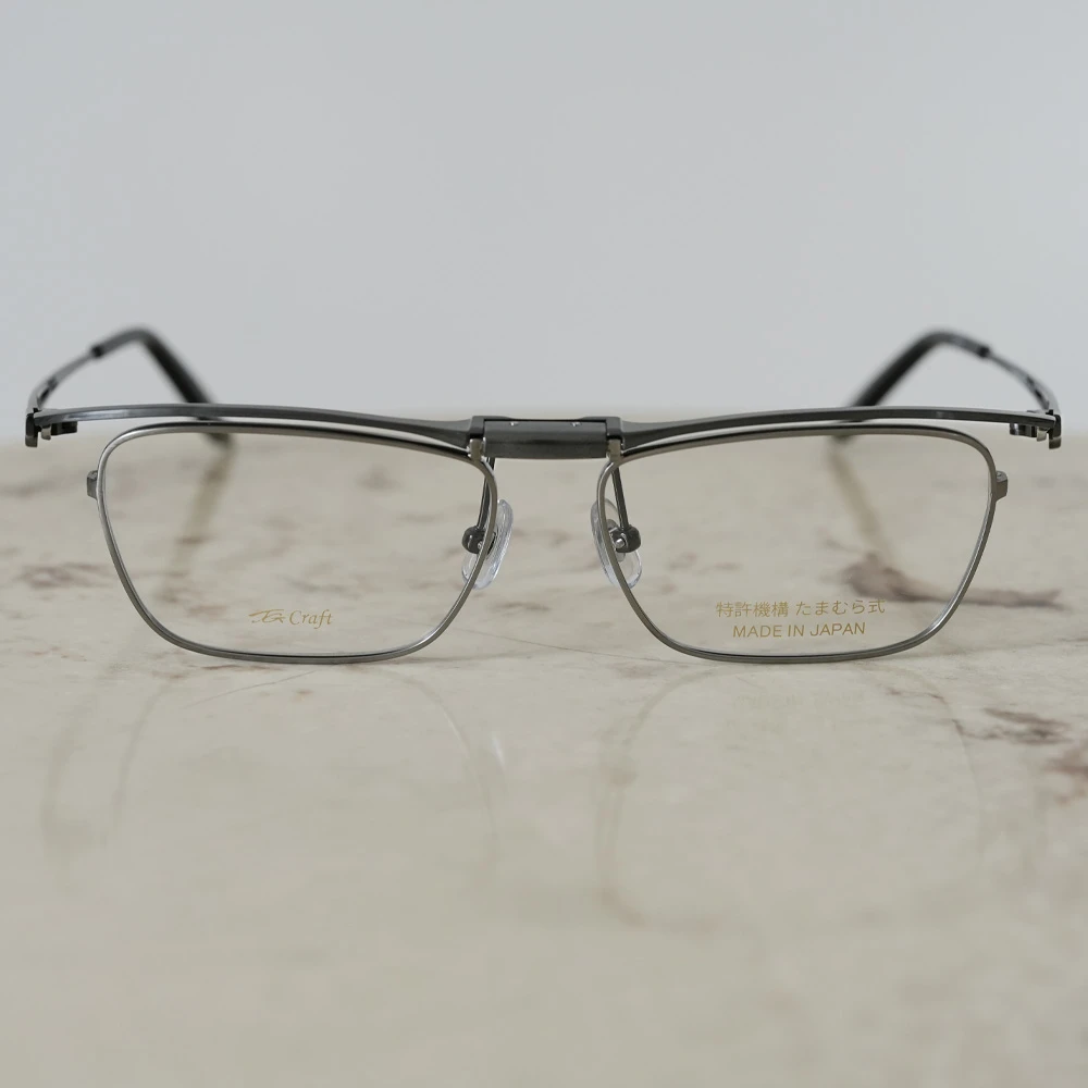 創業約40年の福井県の眼鏡製造会社「たまむら眼鏡」のオリジナルブランド「TGクラフト」の跳ね上げメガネ。特許取得の緩みにくく、ワンタッチで跳ね上がるオリジナルの機構を採用した小さいスクエアフレーム。レンズ間距離(ブリッジ幅)は狭めに設定されているため、お顔の小さい方にもお勧めできます。チタン素材を使用した日本製フレームは非常に軽量で掛け心地が良いのも魅力です。