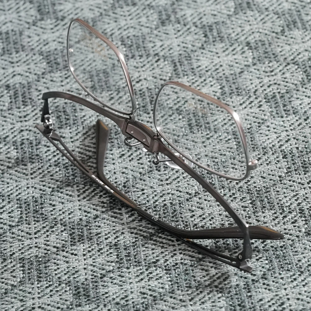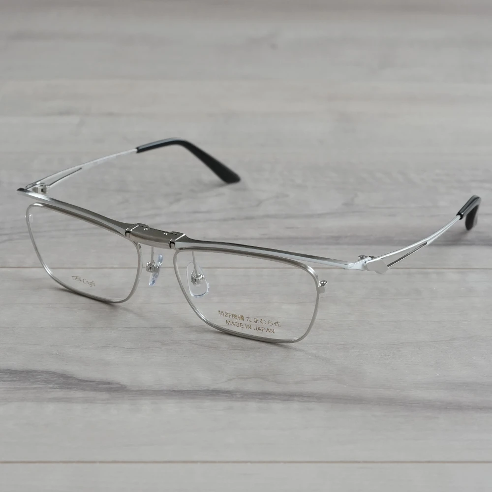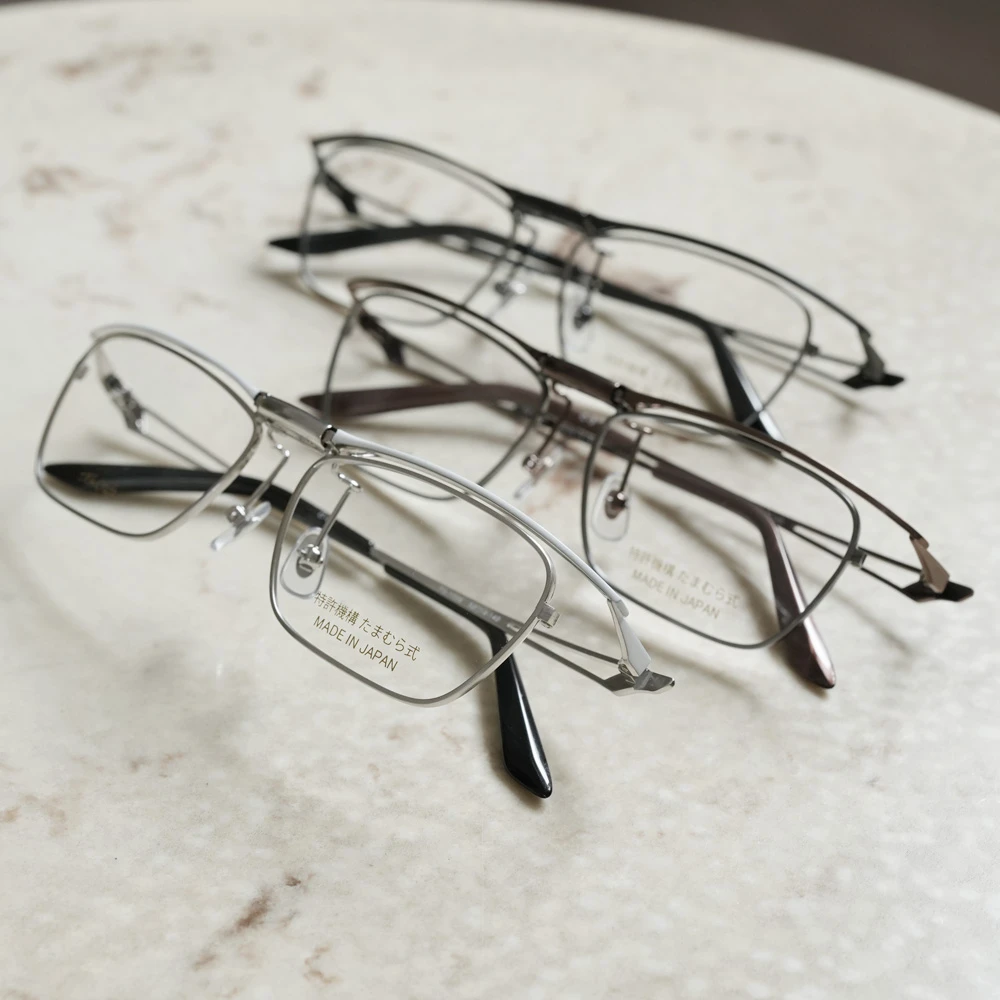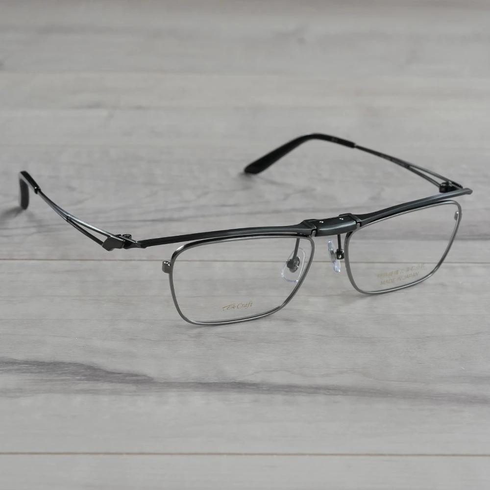創業約40年の福井県の眼鏡製造会社「たまむら眼鏡」のオリジナルブランド「TGクラフト」の跳ね上げメガネ。特許取得の緩みにくく、ワンタッチで跳ね上がるオリジナルの機構を採用した小さいスクエアフレーム。レンズ間距離(ブリッジ幅)は狭めに設定されているため、お顔の小さい方にもお勧めできます。チタン素材を使用した日本製フレームは非常に軽量で掛け心地が良いのも魅力です。